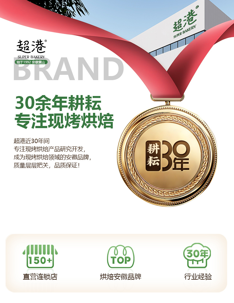 超港创立于1992年,是一家集生产销售面包、蛋糕、传统糕点、中西点于一体的全国性连锁烘焙企业,拥有百余家直营门店。超港以“玩味烘焙、文创美学”为经营理念。