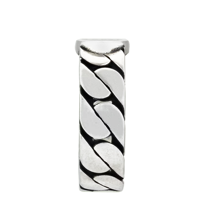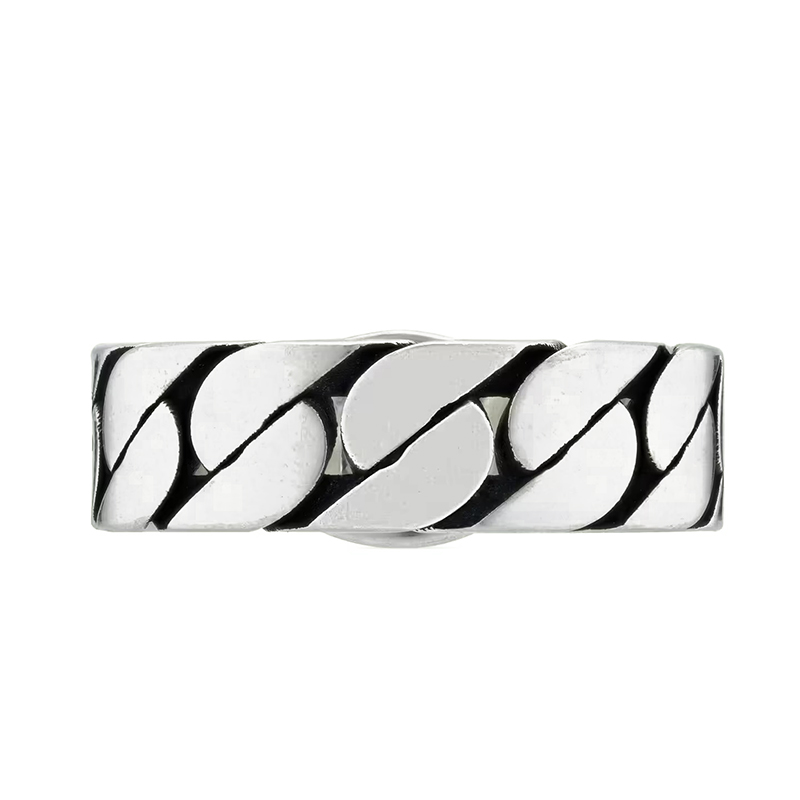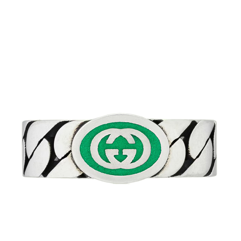 这款匠心打造的戒指单品拥有宽阔的马衔索链结构,彰显都市美学。绿色珐琅互扣式双G交织字母为这款银饰增添亮眼细节。