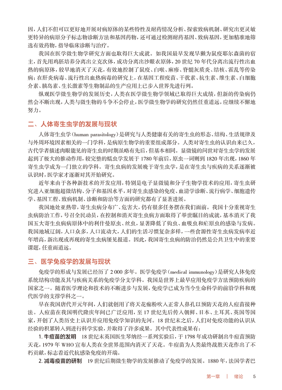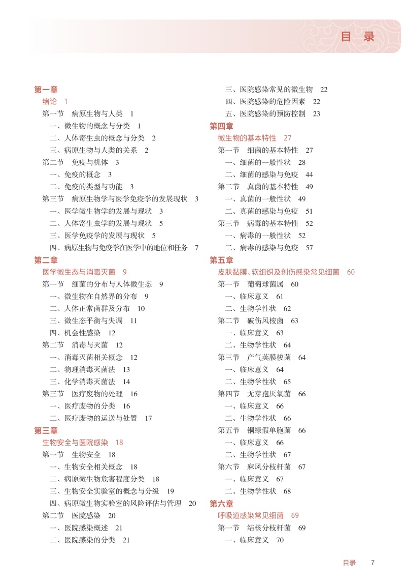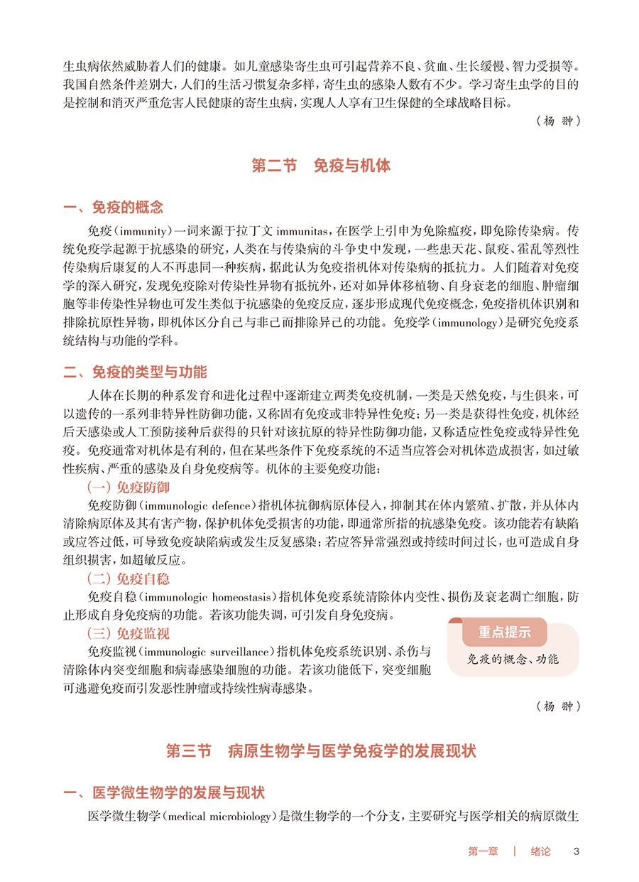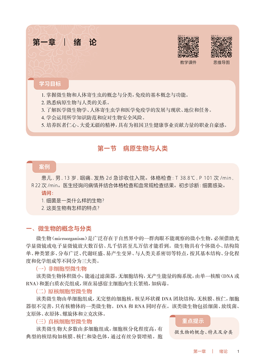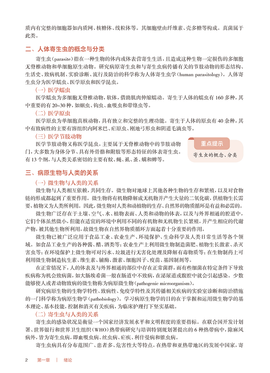 本教材为高等职业教育专科护理类专业“十四五”规划教材、国家卫生健康委员会“十四五”规划教材之一。本教材将围绕护理类专业人才培养目标,结合护士执业资格考试的要求,从深度、广度及侧重点上把握护理类专业特色,力争体现“三基”“五性”。将病原生物(医学微生物学、人体寄生虫学)和医学免疫学基础三部分的既相互独立又相互渗透的学科内容进行有机整合,在考虑维持学科系统性、完整性的同时,将最大限度地将教材内容避免重复,并突出护理类专业的实用性、针对性和适度性、够用性,对与护理类专业关系不密切的内容进行压缩或删减。考虑到本基础课程与护理类专业学生学习后续如传染病护理学等专业拓展、专业核心课程的有机衔接,将教材分为上下二篇,上篇为病原生物(医学微生物学、人体寄生虫学),下篇为医学免疫学基础。在医学微生物学中增加医学微生态概述与生物安全,将形态与结构、生长繁殖与代谢等内容整合为微生物的基本特性,并按系统主要引起疾病的病原性细胞进行归类来进行总体布局,对每一种病原菌内容按生物学性状、临床意义来编写。