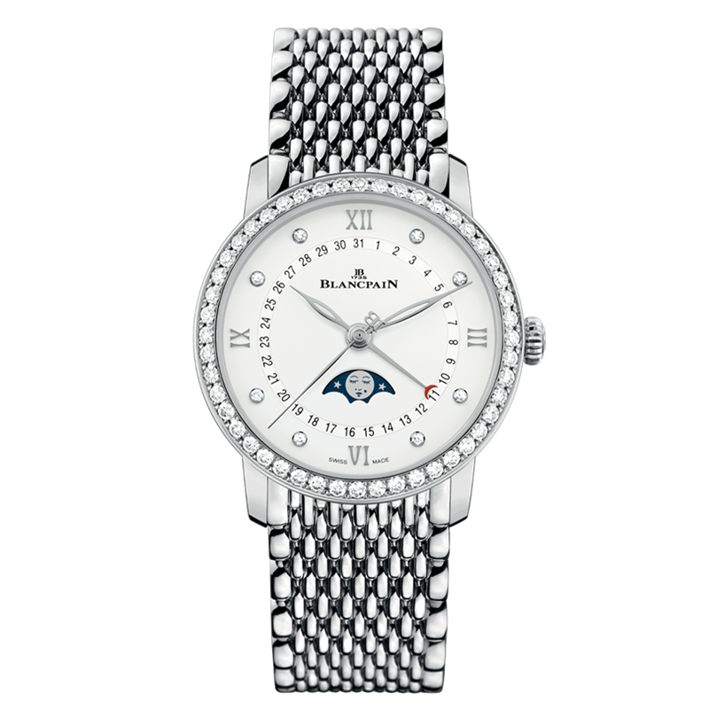 镜面 材质 | 蓝宝石水晶玻璃 | 表盘 | 精钢镶钻表壳 白色表盘 日期显示 月相 |