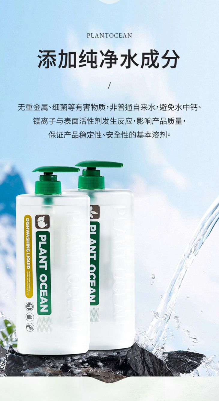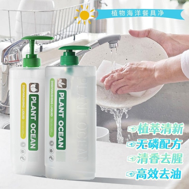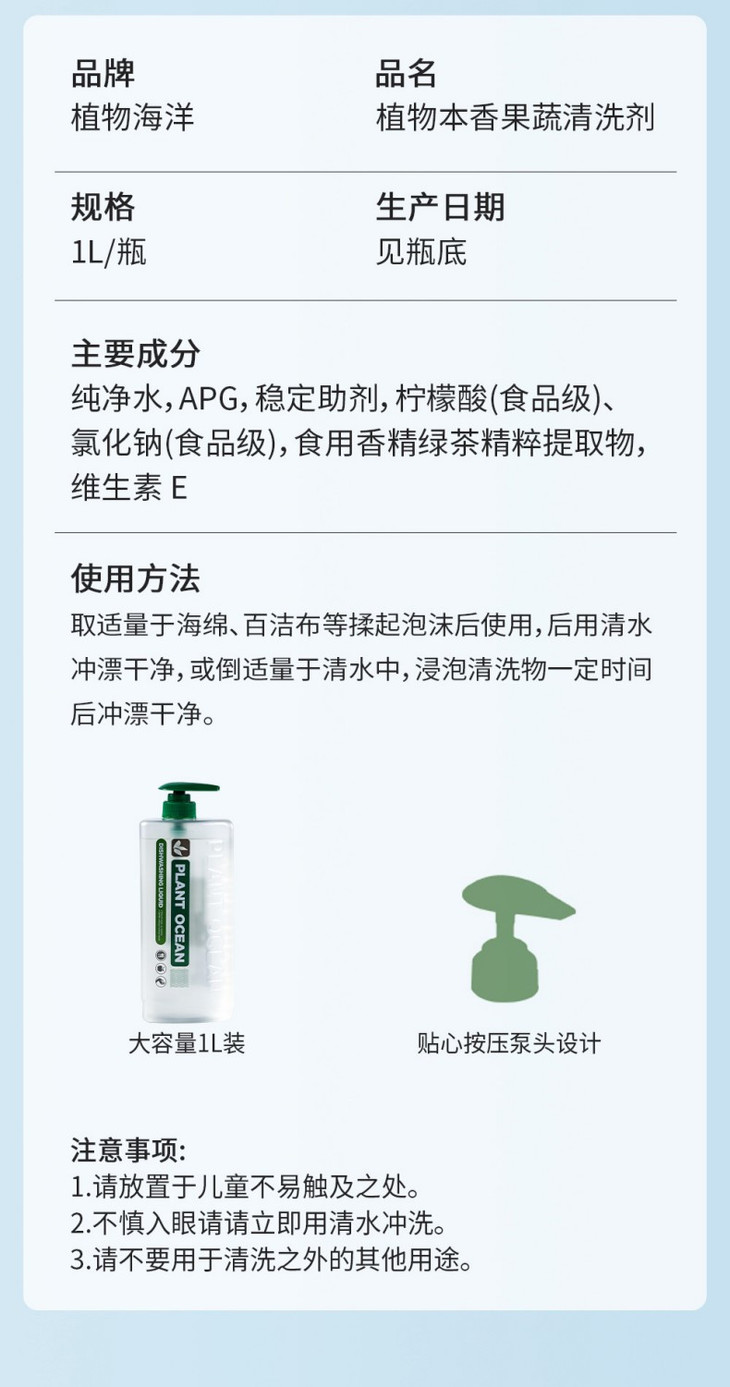 植物海洋果蔬餐具清洗剂(植物本香):植萃清新,无磷配方,含绿茶精粹提取物,清香去腥,高效去油,味道不刺鼻,洁净新体验~