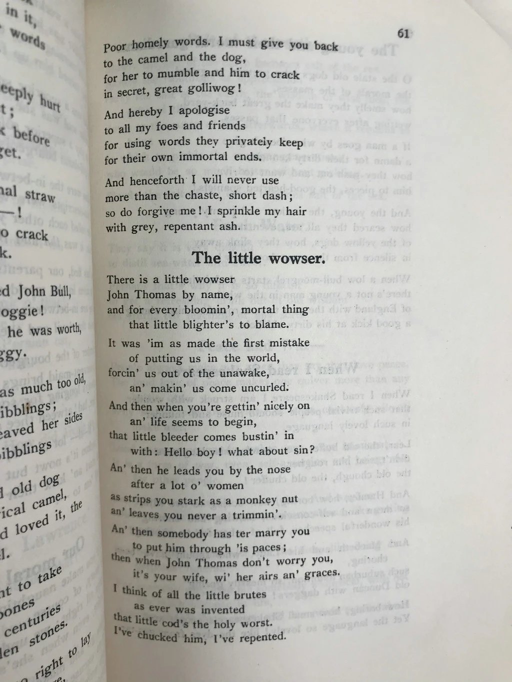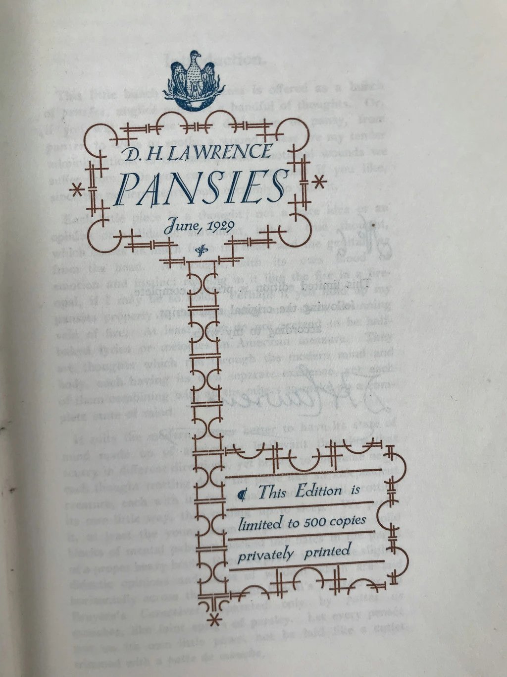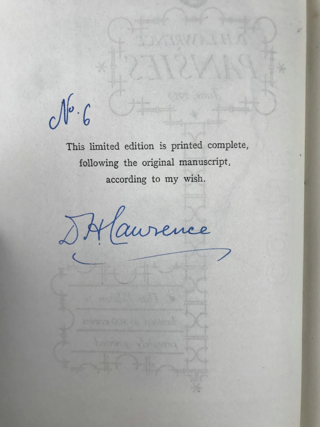 本书为仅发行500册的限量版图书,编号6,卷首有限量标示,以及作者D. H. Lawrence的亲笔签名,本书在作者去世前一年出版,1930年D. H. Lawrence因肺结核在法国逝世,年仅44岁。