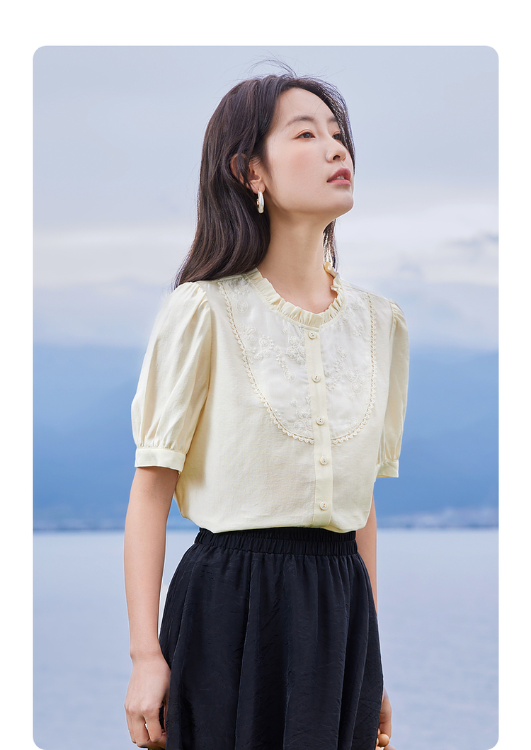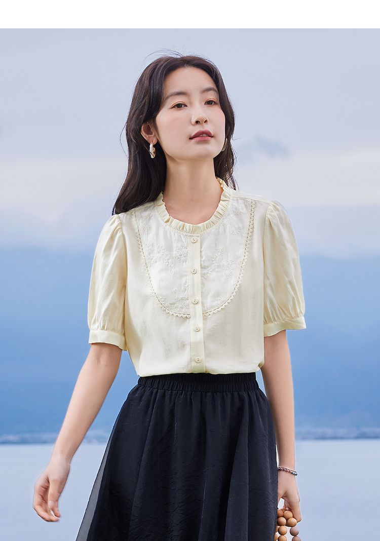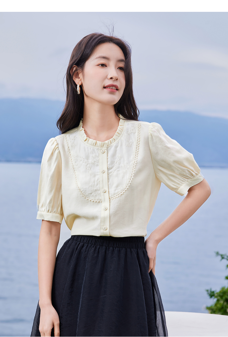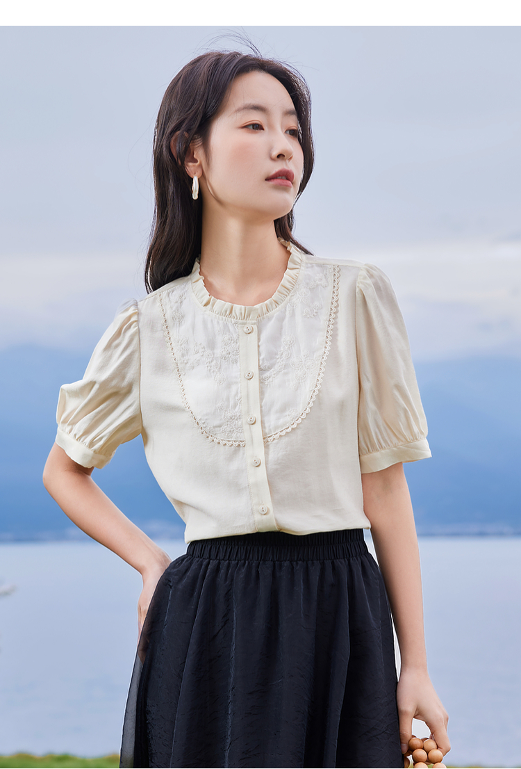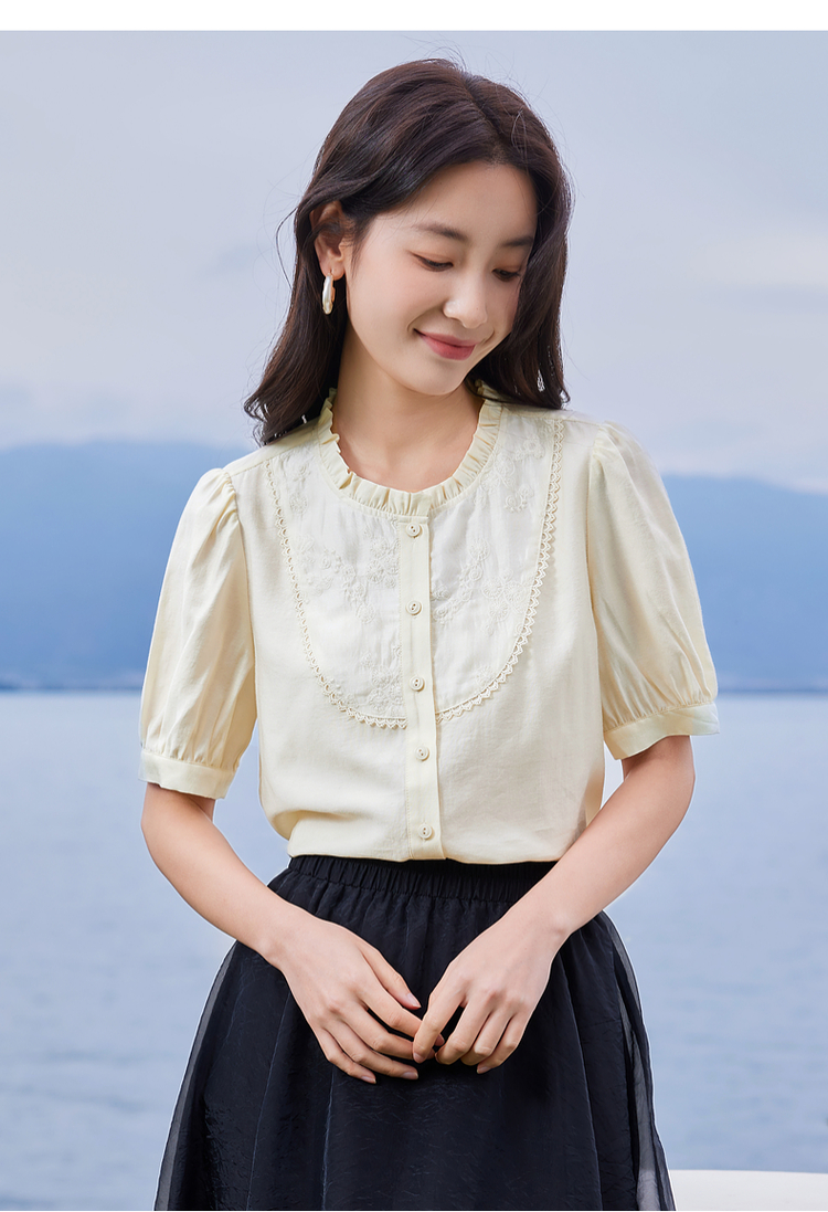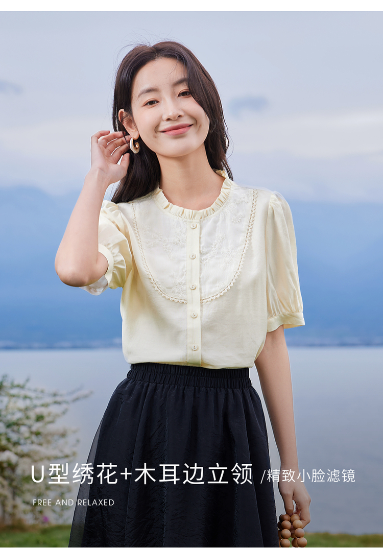 【专属特价】熙世界法式木耳边立领雪纺衫泡泡袖莱赛尔天丝上衣女2025夏季新款