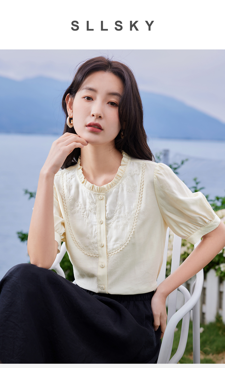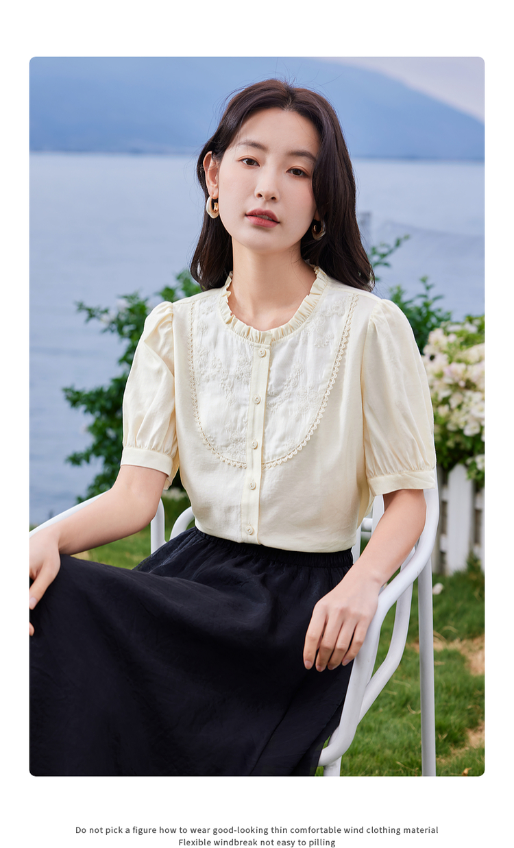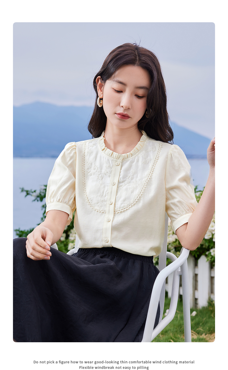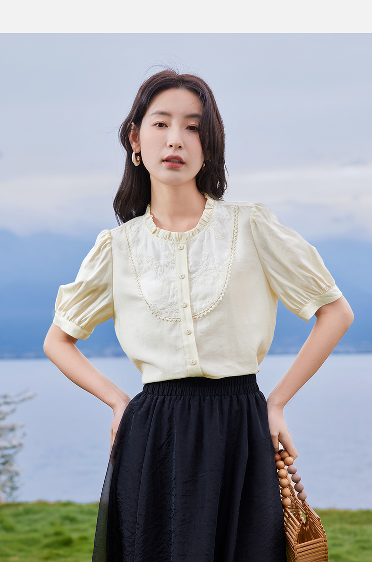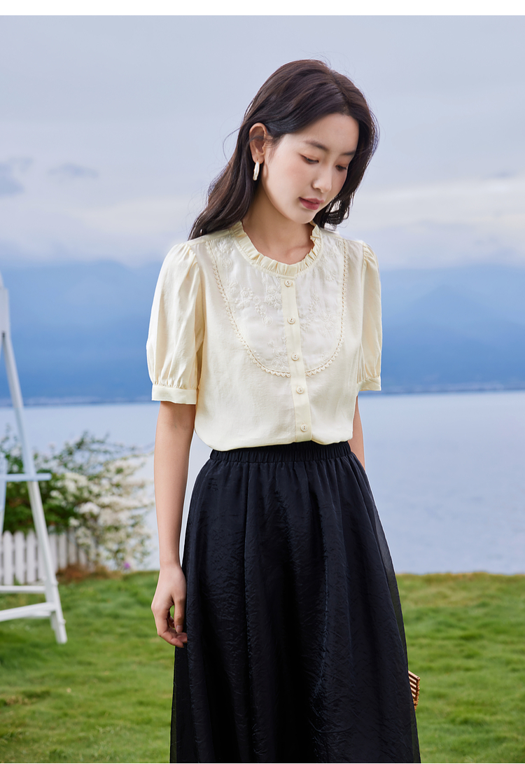 【专属特价】熙世界法式木耳边立领雪纺衫泡泡袖莱赛尔天丝上衣女2025夏季新款