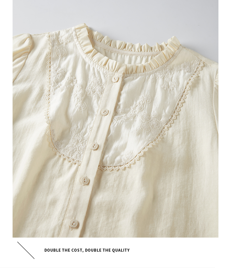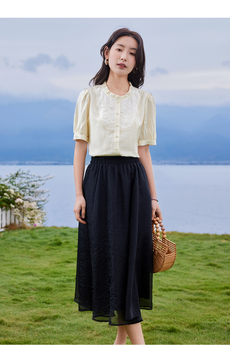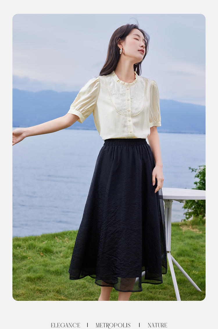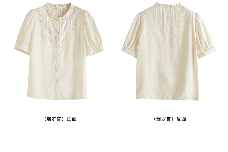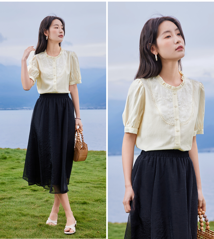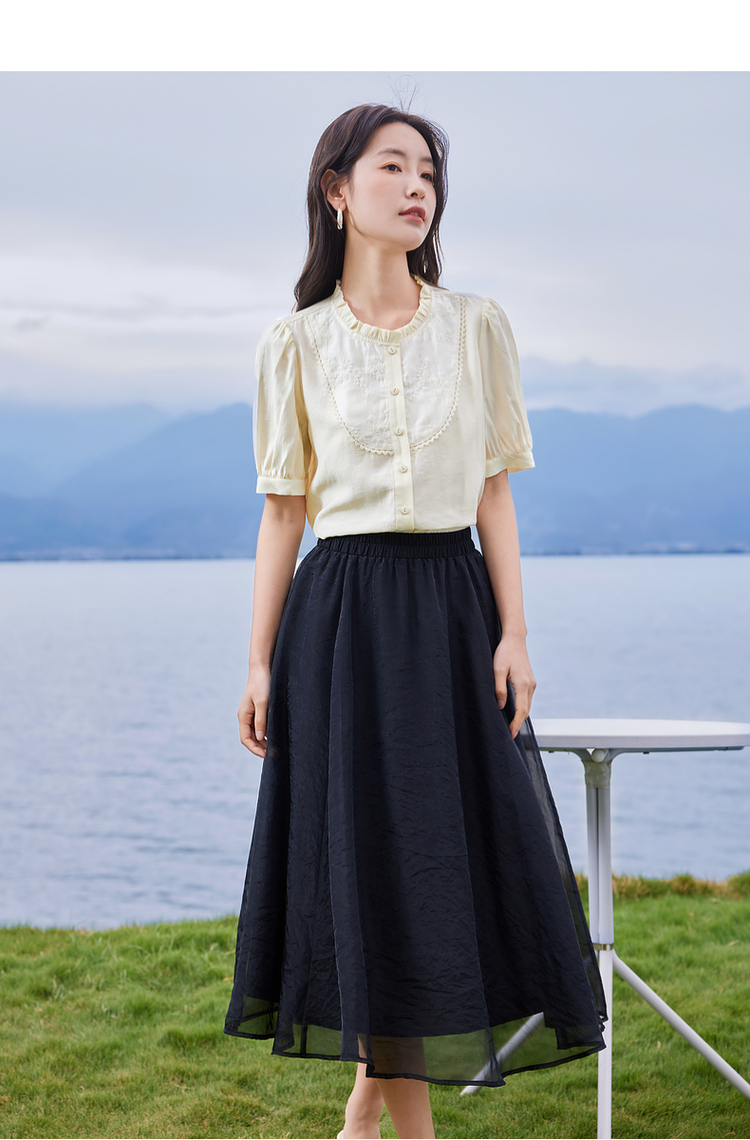 【专属特价】熙世界法式木耳边立领雪纺衫泡泡袖莱赛尔天丝上衣女2025夏季新款