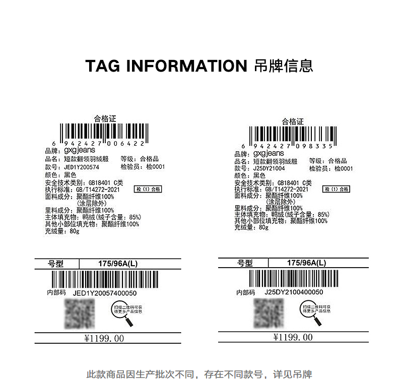 gxg.jeans男装2024年冬季新款短款翻领羽绒服J25DY21004