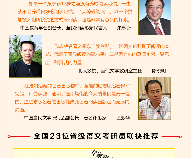 一句名言可以影响人的一生。在众多学生用的名著版本中,唯独商务版的名著是以励志为核心理念的。我们都知道,好书必然是能启迪人性和给人以精神滋养的。因此,我们特别关注每一本名著中所传递的宝贵人生经验和成长智慧。