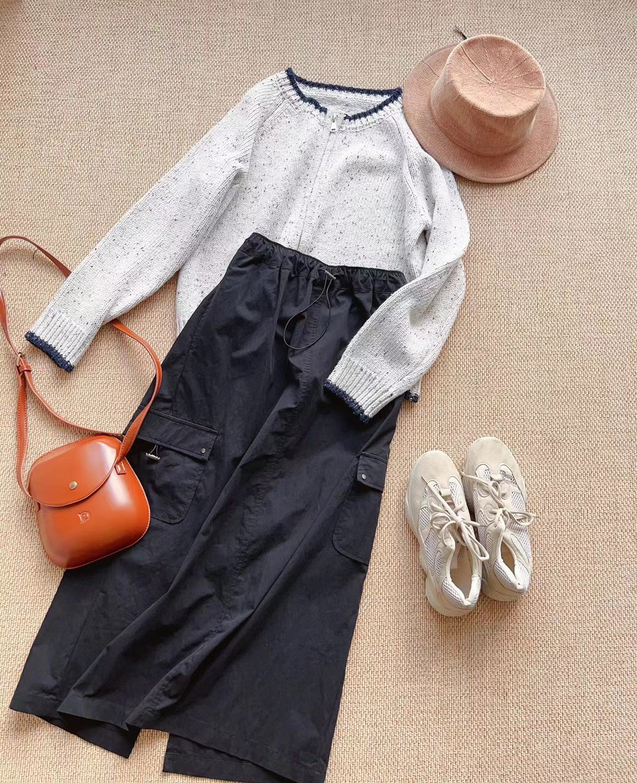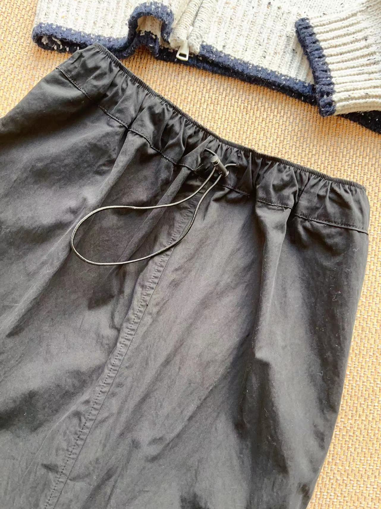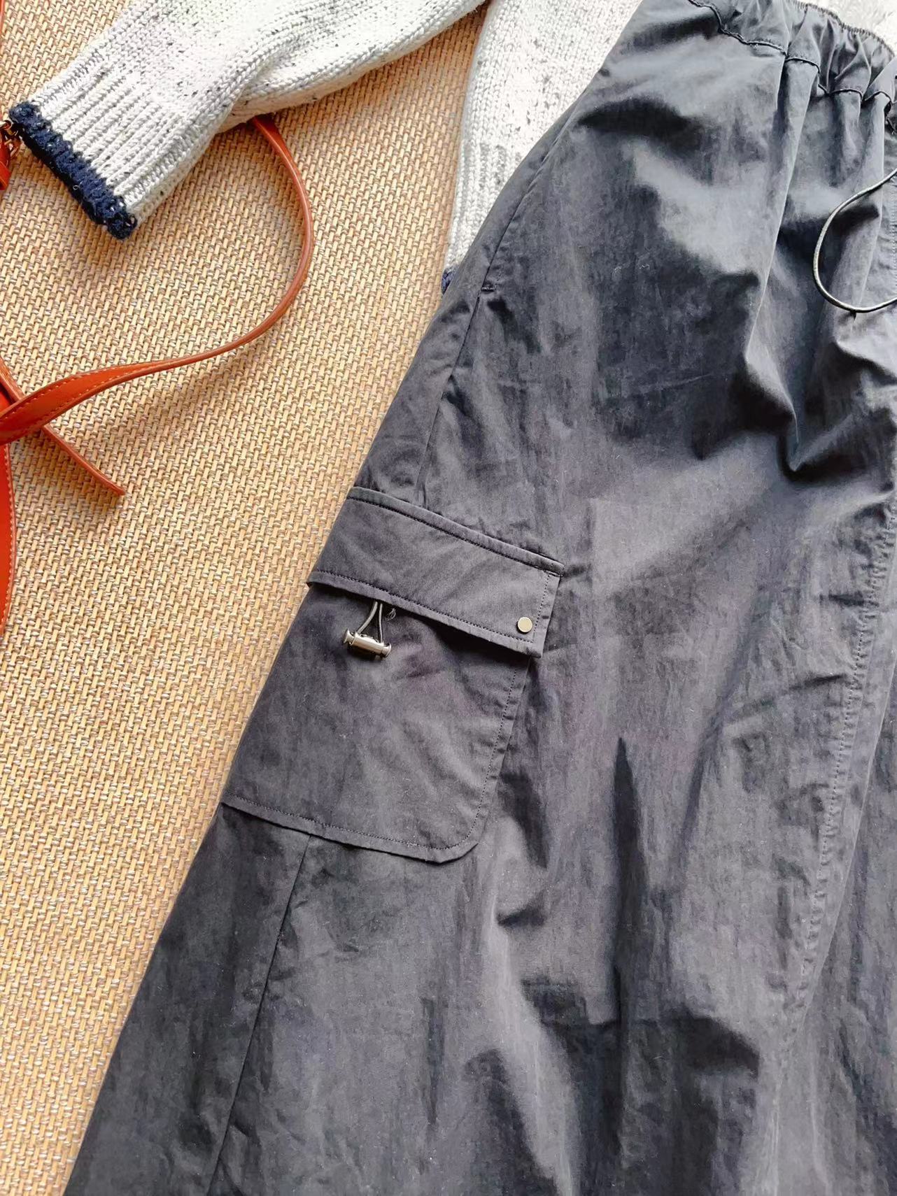 黑色巨百搭,松紧腰+金属扣抽绳,穿脱方便自在,裙子两侧大口袋以及金属猪鼻扣抽绳设计,充满工装风元素,个性细节感满满!H裙型裁剪,对于下半身不完美,腿型不好以及梨型身材的菇凉都灰常友好,显瘦极了!背面做了开叉设计,真的是360度的好看~~