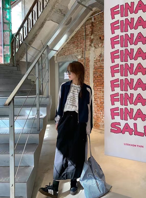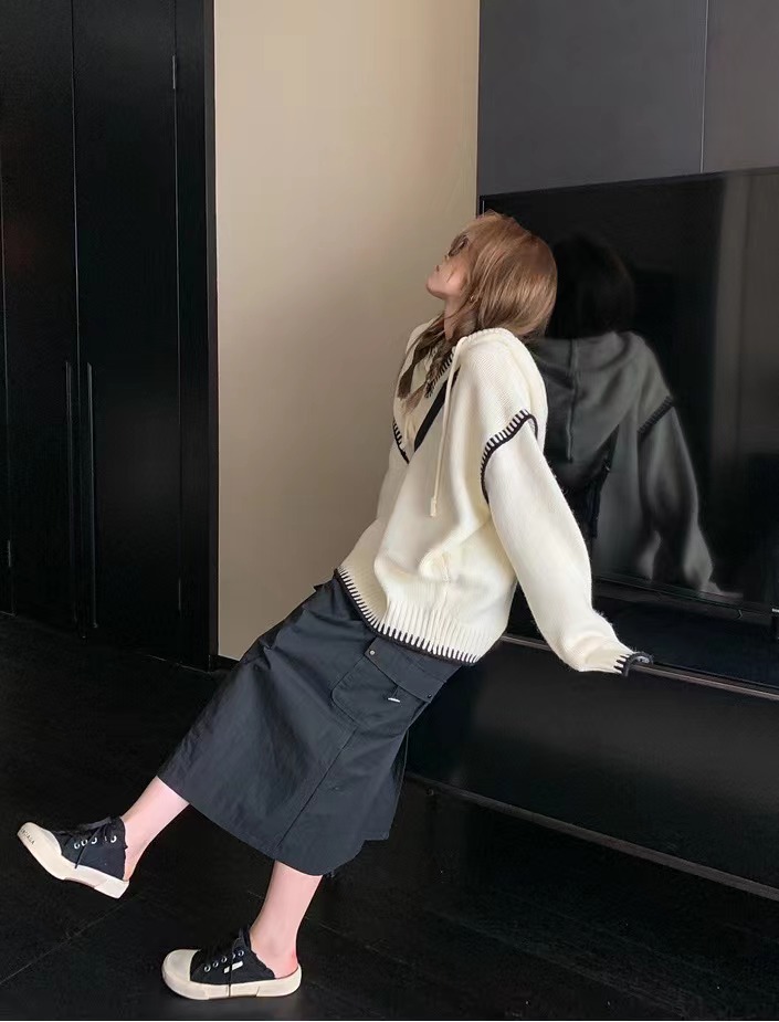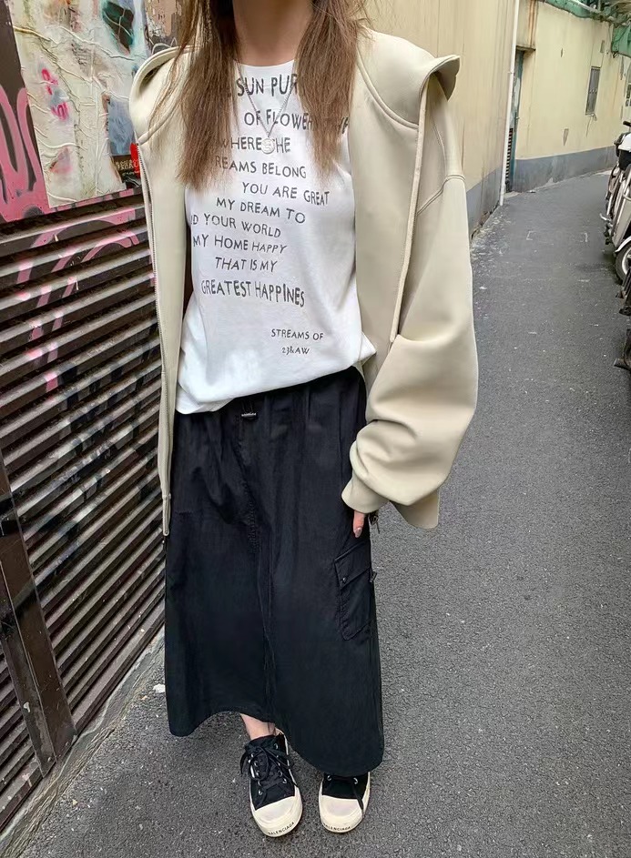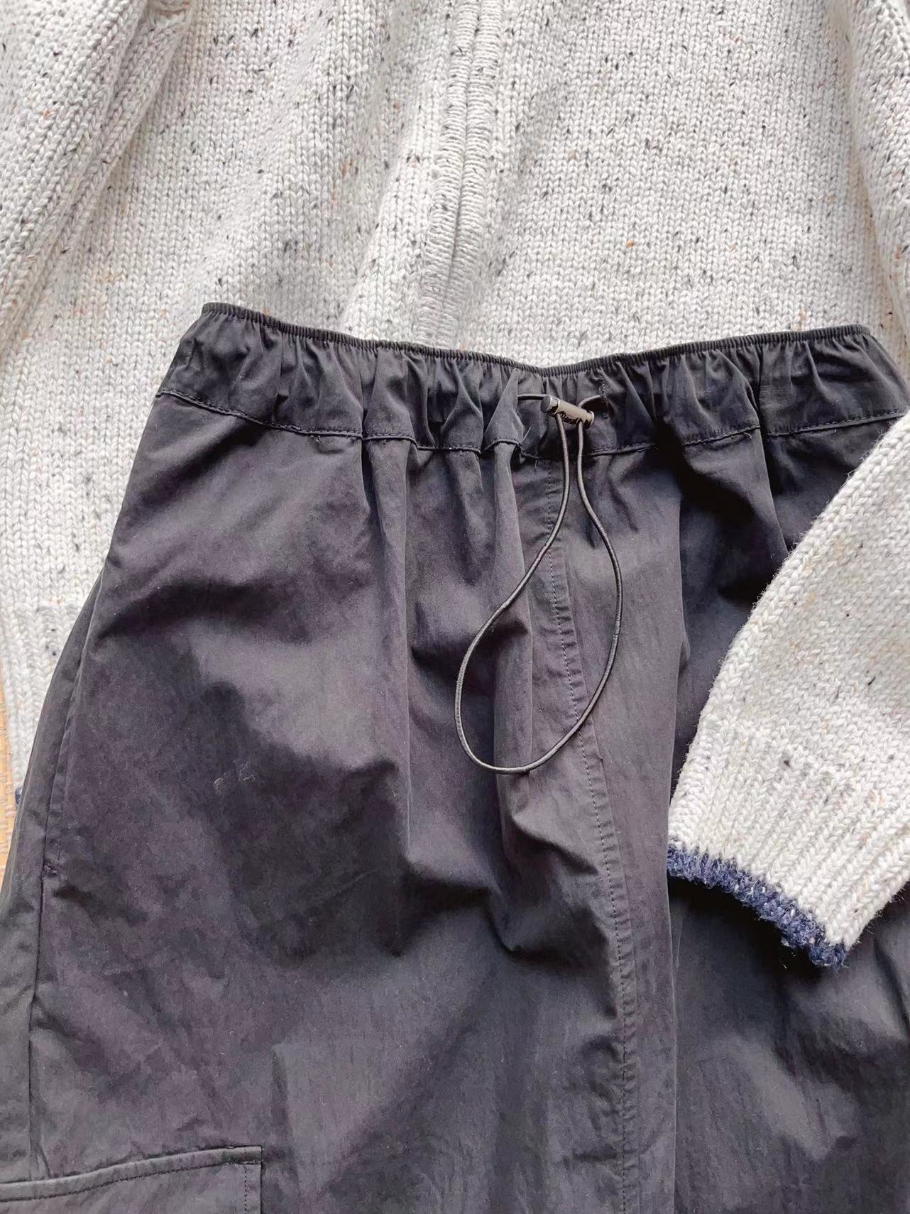 黑色巨百搭,松紧腰+金属扣抽绳,穿脱方便自在,裙子两侧大口袋以及金属猪鼻扣抽绳设计,充满工装风元素,个性细节感满满!H裙型裁剪,对于下半身不完美,腿型不好以及梨型身材的菇凉都灰常友好,显瘦极了!背面做了开叉设计,真的是360度的好看~~