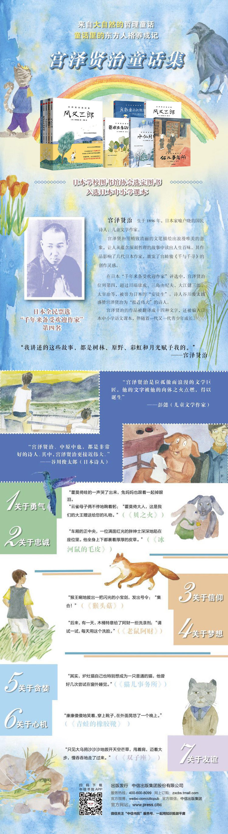 宫泽贤治在童话中寄寓了对大自然、对社会、对人生的探索和思考,满溢着对生活的美好感受,真挚而深邃,浪漫而冷峻,善良而慈悲,具有独特的人文气质,堪称“哲理童话”。