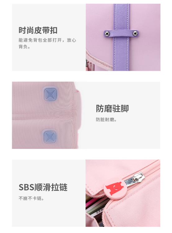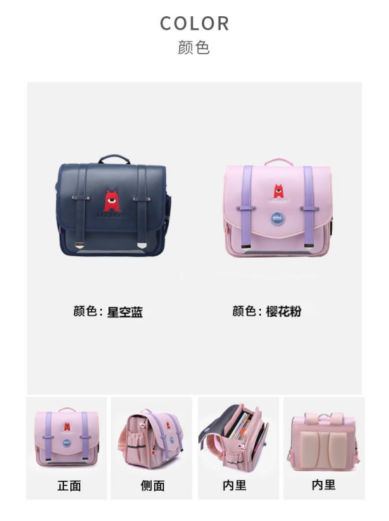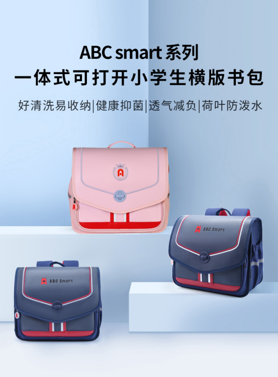 包型前片由一根拉链贯穿,一拉到底,书包完全打开成两片,可以轻松清洗到每个边角部位,