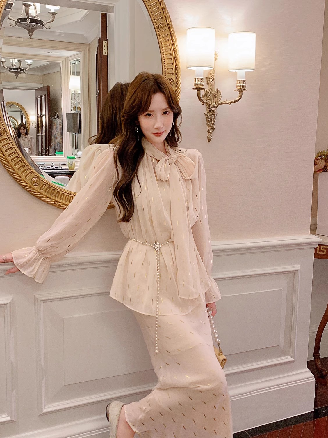 张心子【鎏金岁月】烫金法式女神范御姐雪纺套装女秋装裙子两件套 U2408033