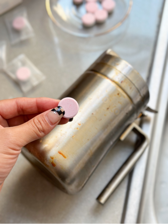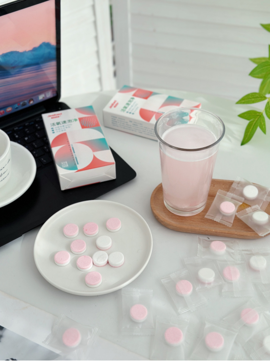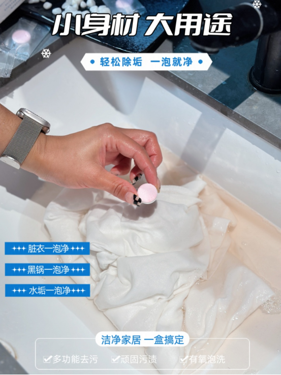 用一次就爱上的小小一片活氧速泡净 小身材,大用途 加50度左右的温水浸泡织物或器具,再把活氧速泡净丢进去,可以看到它在水里迅速冒泡开,😎就像泡腾片扔进水里的样子。 静置5到15分钟,就能看到污垢在慢慢被分解出来~揉洗或用清水冲洗/毛巾擦拭即可。🙀 PS:水温越高,活氧速泡净遇水的反应就越激烈。为加速溶解速度,我们选用50度左右的温水