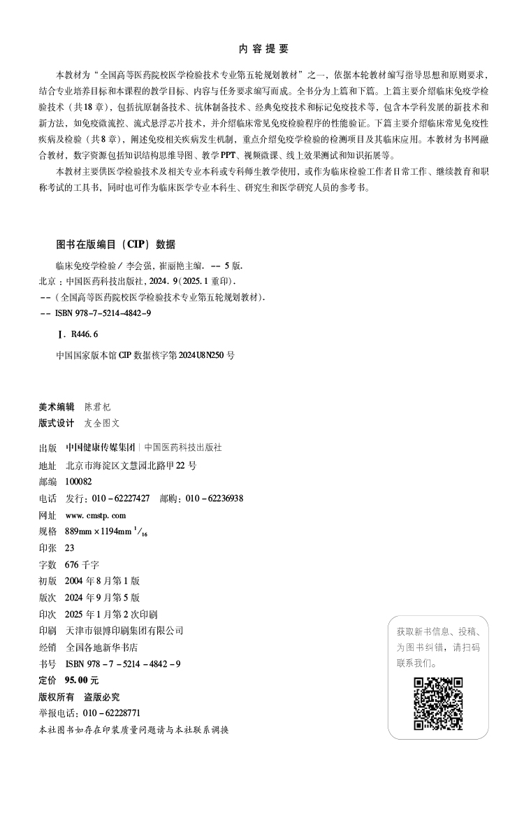 临床免疫学检验 第5五版 全国高等医药院校医学检验技术专业第五轮规划教材 李会强 崔丽艳主编 9787521448429中国医药科技出版社