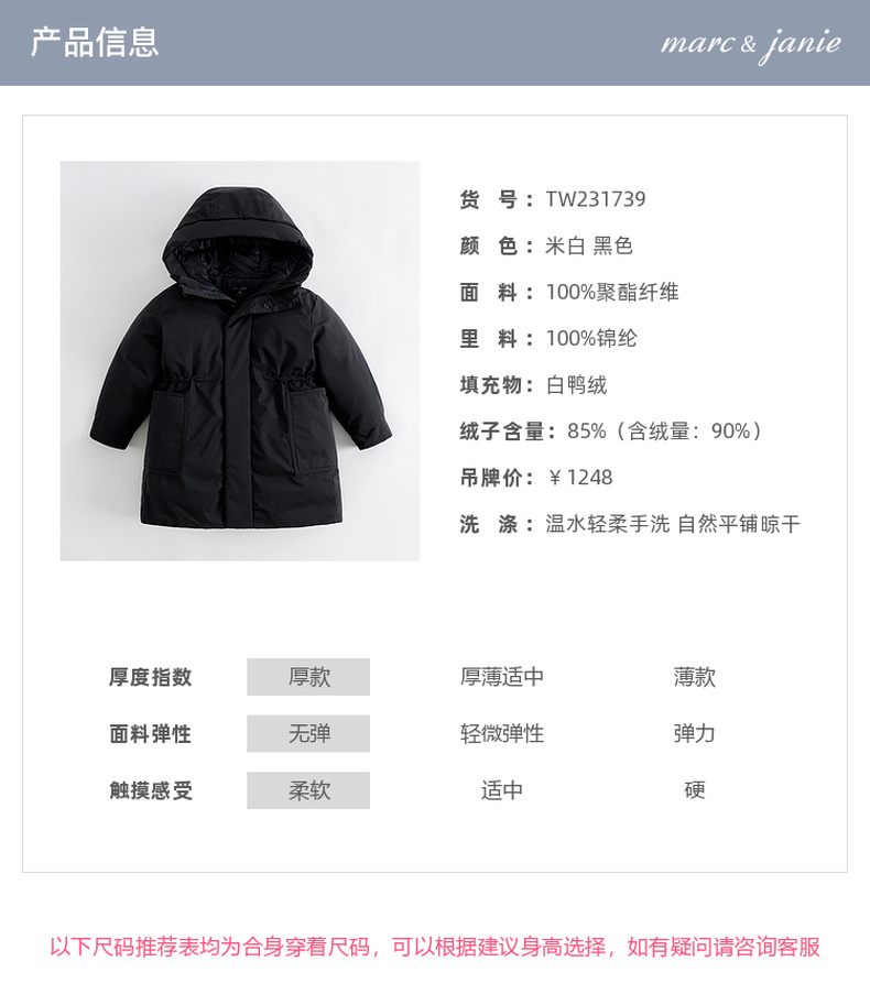 【三防】马克珍妮冬装新款 女童休闲连帽长款羽绒服 231739