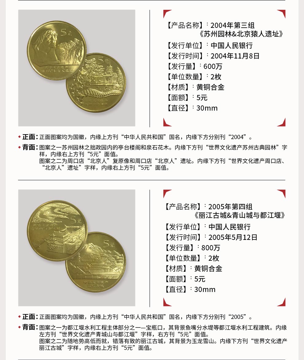 世界文化遗产纪念币珍藏册内含:万里长城、秦始皇陵及兵马俑坑、曲阜孔庙孔林孔府、明清故宫、苏州古典园林、周口店“北京人”遗址、青城山与都江堰、丽江古城、颐和园和龙门石窟等十枚普通纪念币。