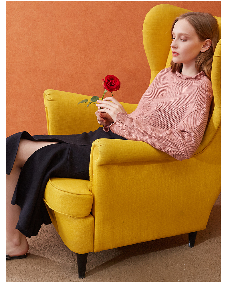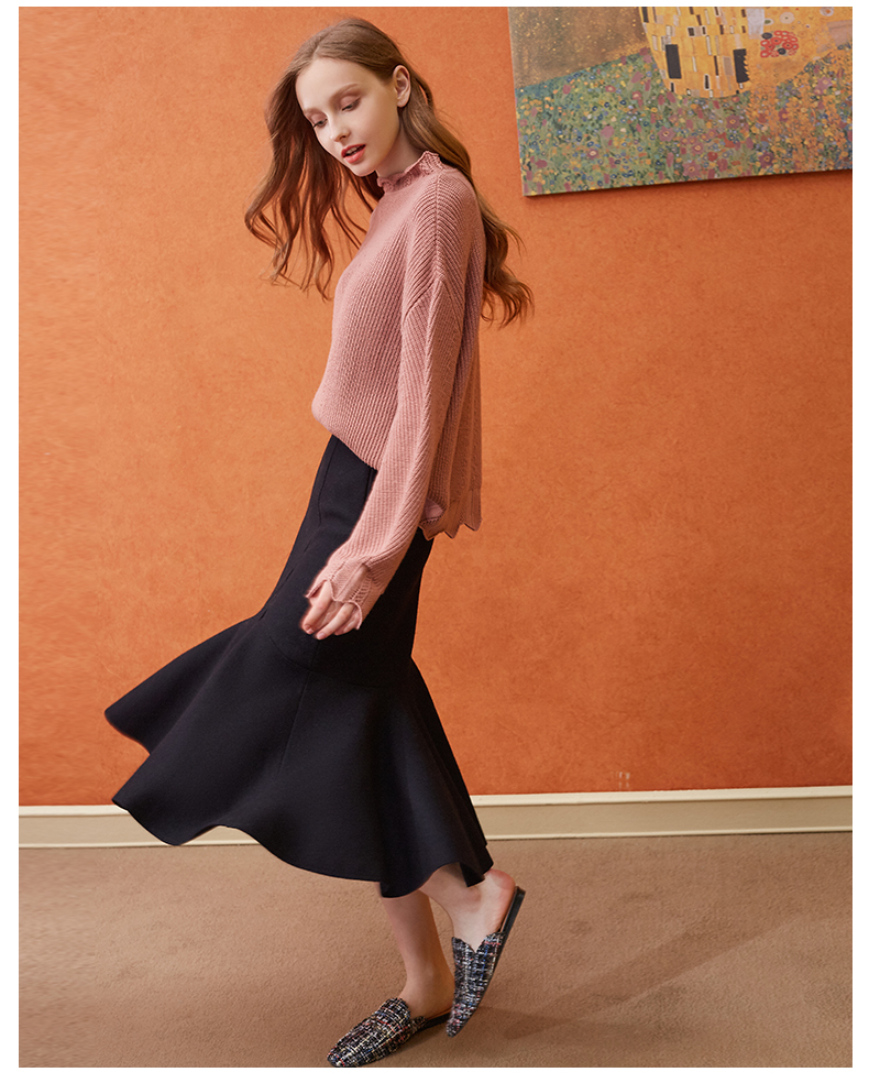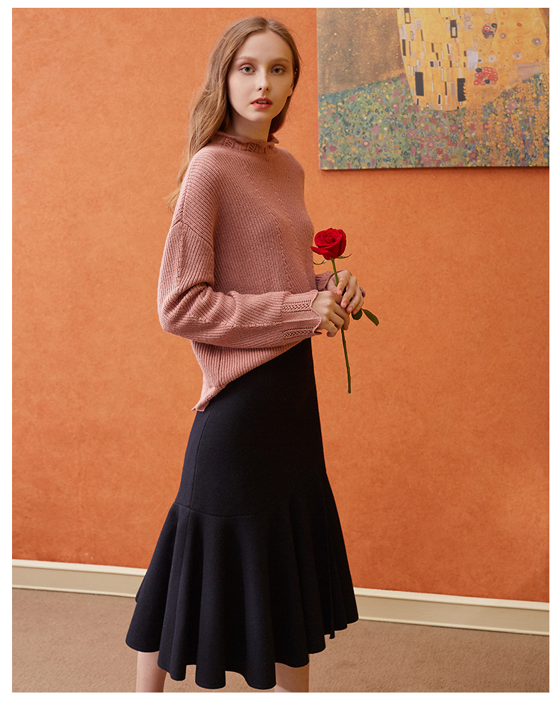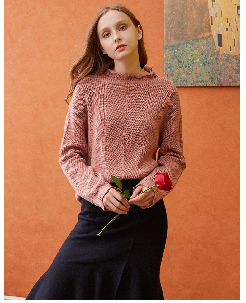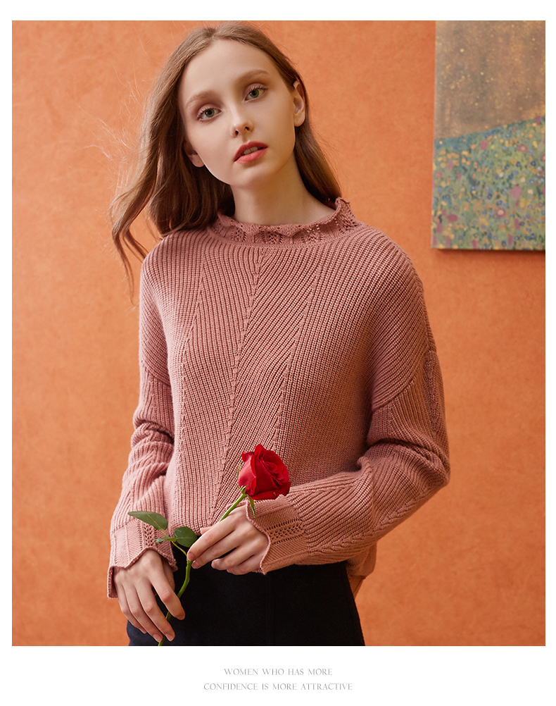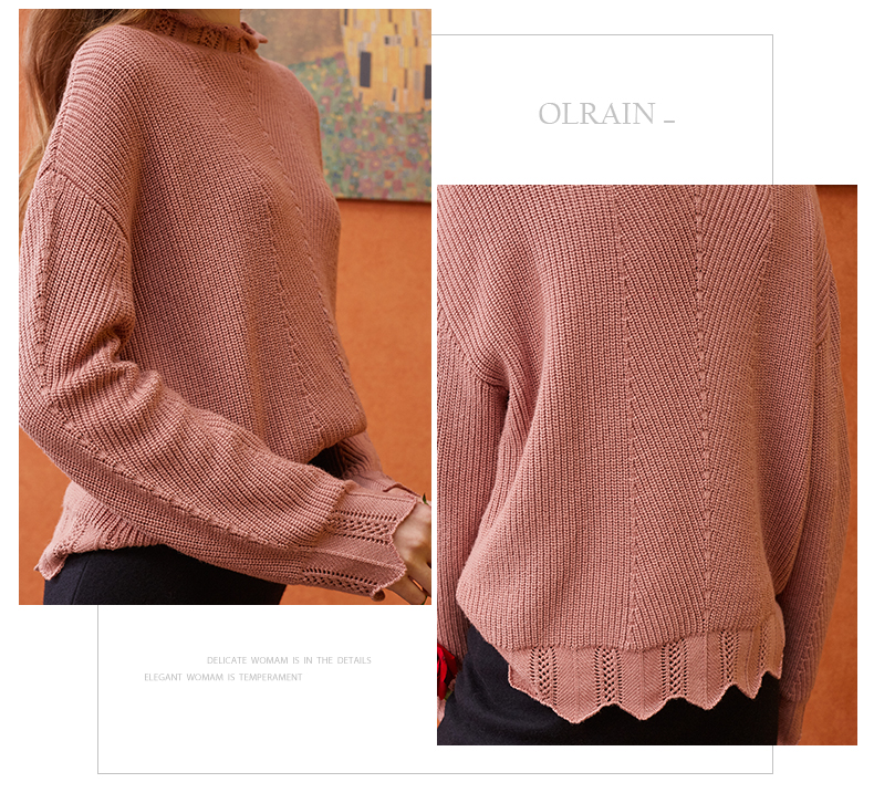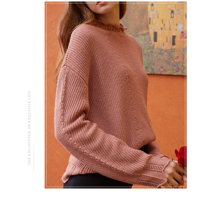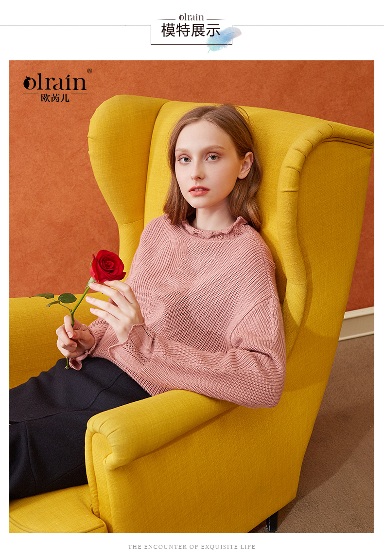 欧芮儿荷叶领毛衣女套头2018秋宽松纯色百搭长袖针织衫