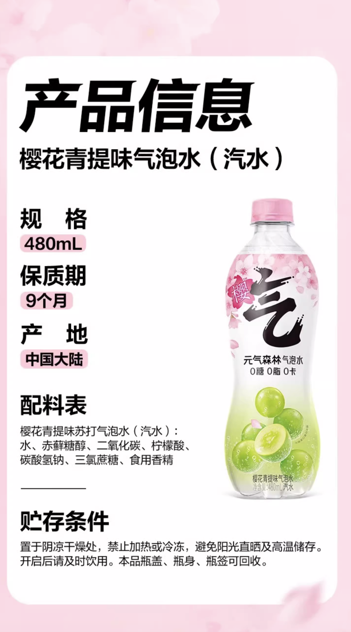 元气森林樱花青提气泡水480ml*15瓶