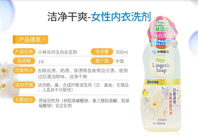 小林制药(KOBAYASHI)洁内宝女性内衣内裤清洗剂生理期专用去血渍去污清洁洗涤剂洗衣液300ml
