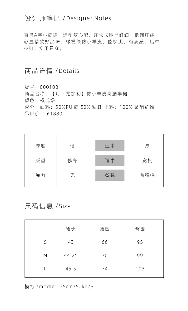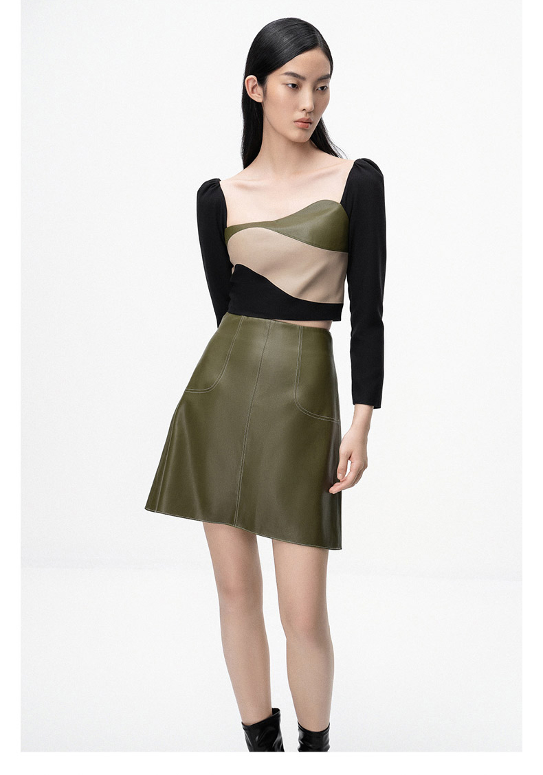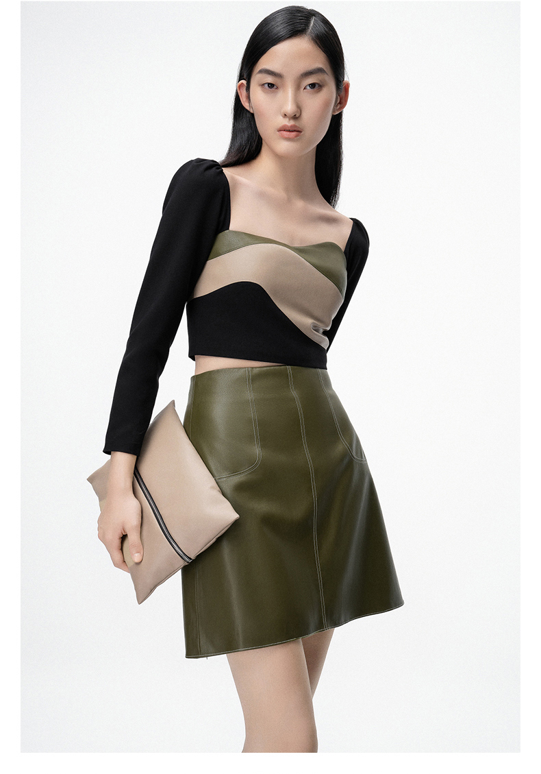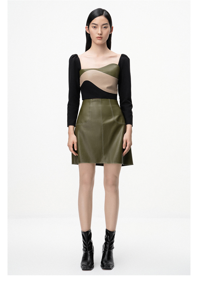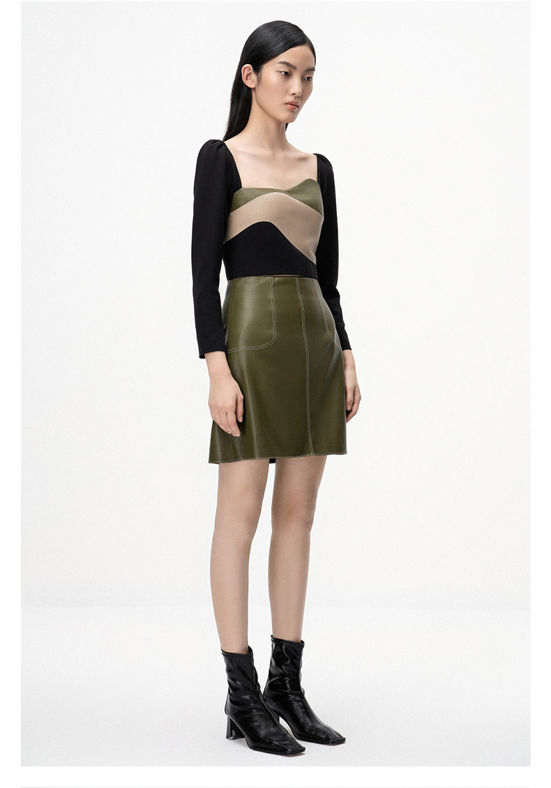 【月下尤加利】橄榄绿仿小羊皮高腰半裙/000108