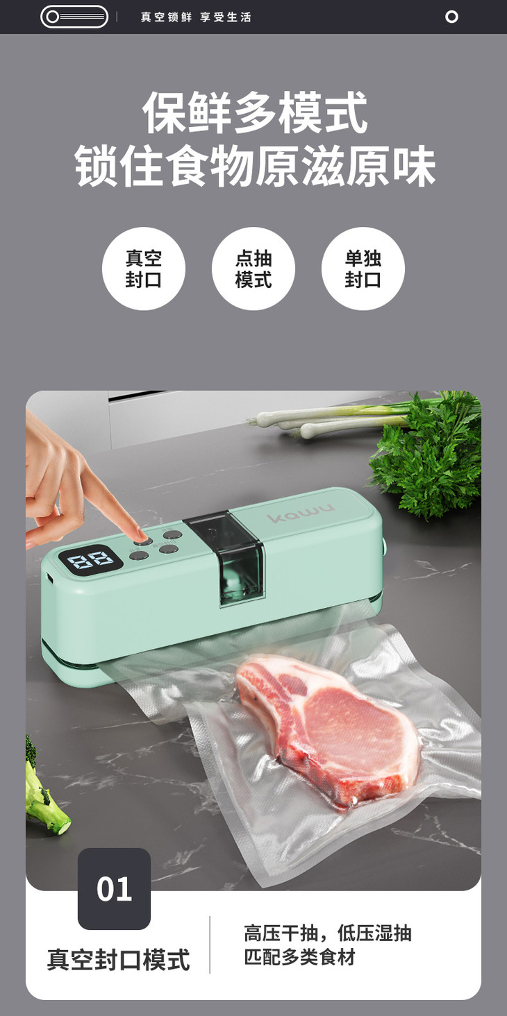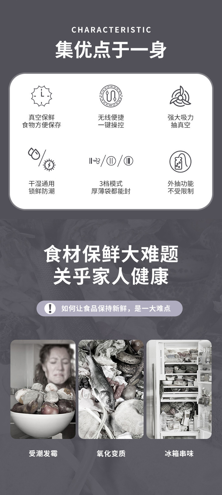 特点 ✅真空保鲜:食物方便保存 ✅无线便捷,一键操控 ✅60KPa强大吸力,抽真空 ✅干湿通用,锁鲜防潮 ✅3档模式,厚薄袋都能封 ✅外抽功能,不受限制