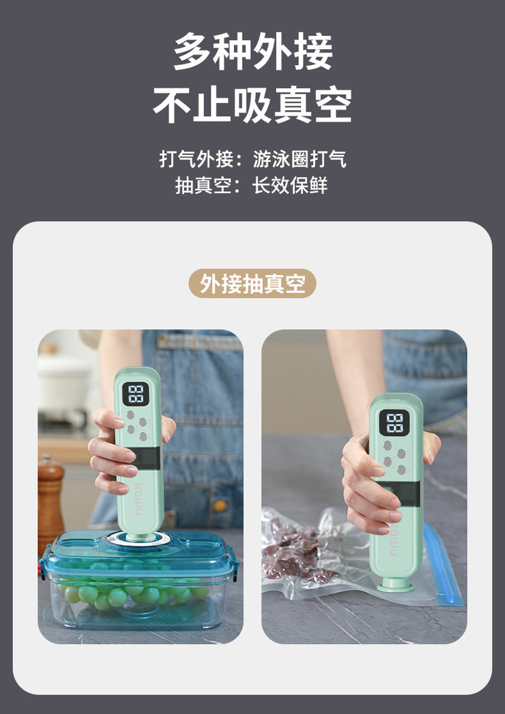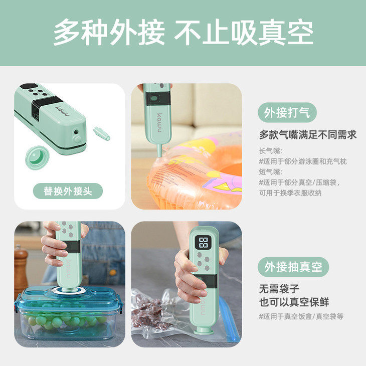 多种外接 不止吸真空 打气外接:游泳圈打气 抽真空:长效保鲜