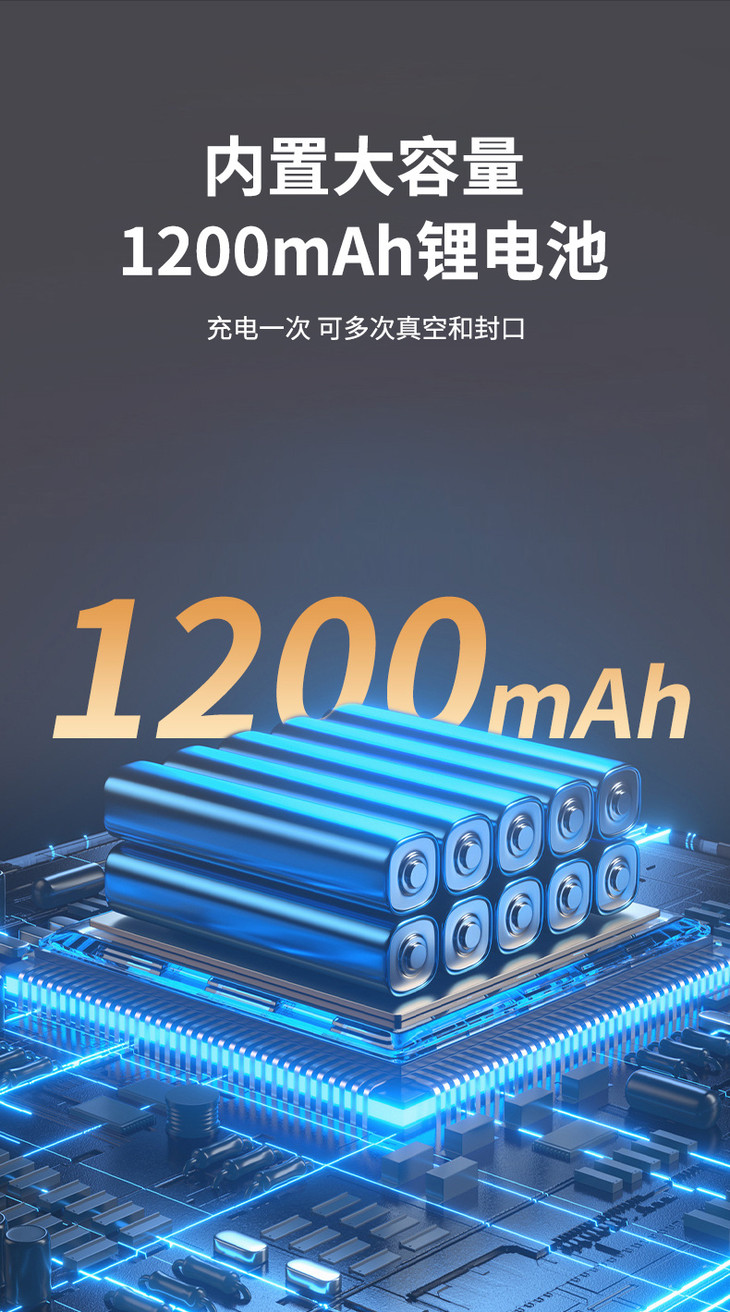 内置大容量 1200mAh锂电池 充电一次 可多次真空和封口