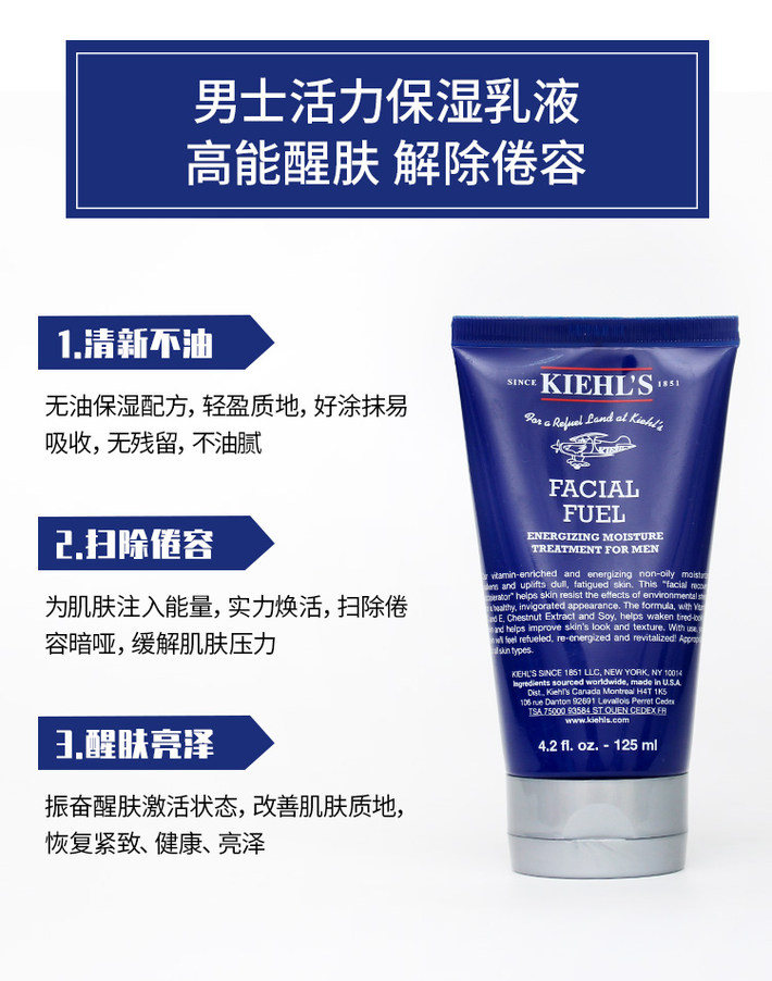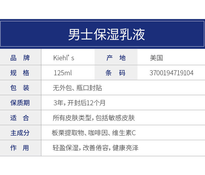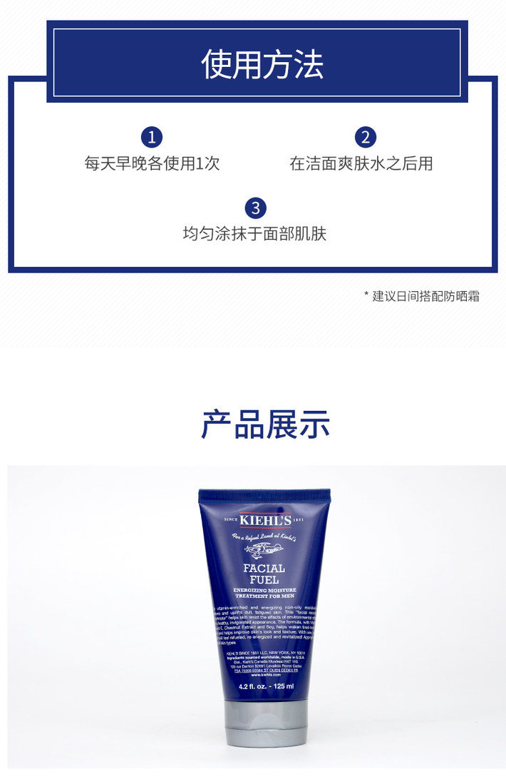 【跨境】Kiehl's 科颜氏 男士高保湿乳液125ml 补水保湿 醒肤亮泽 轻盈保湿(效期到27年9月)