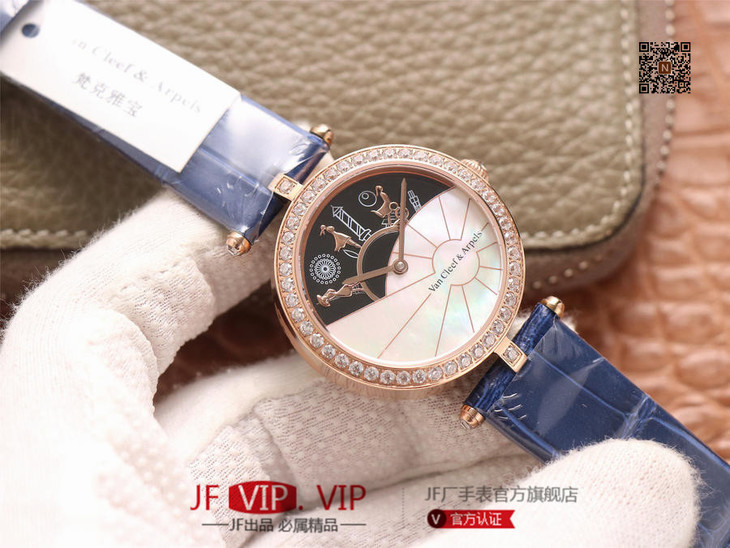JW梵克雅宝诗意复杂功能系列(巴黎的一天),字面A盘由缟玛瑙跟CNC雕刻铜人打造,机械机芯,女士腕表,皮表带,自动机械机