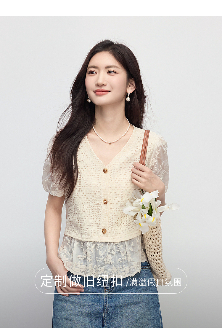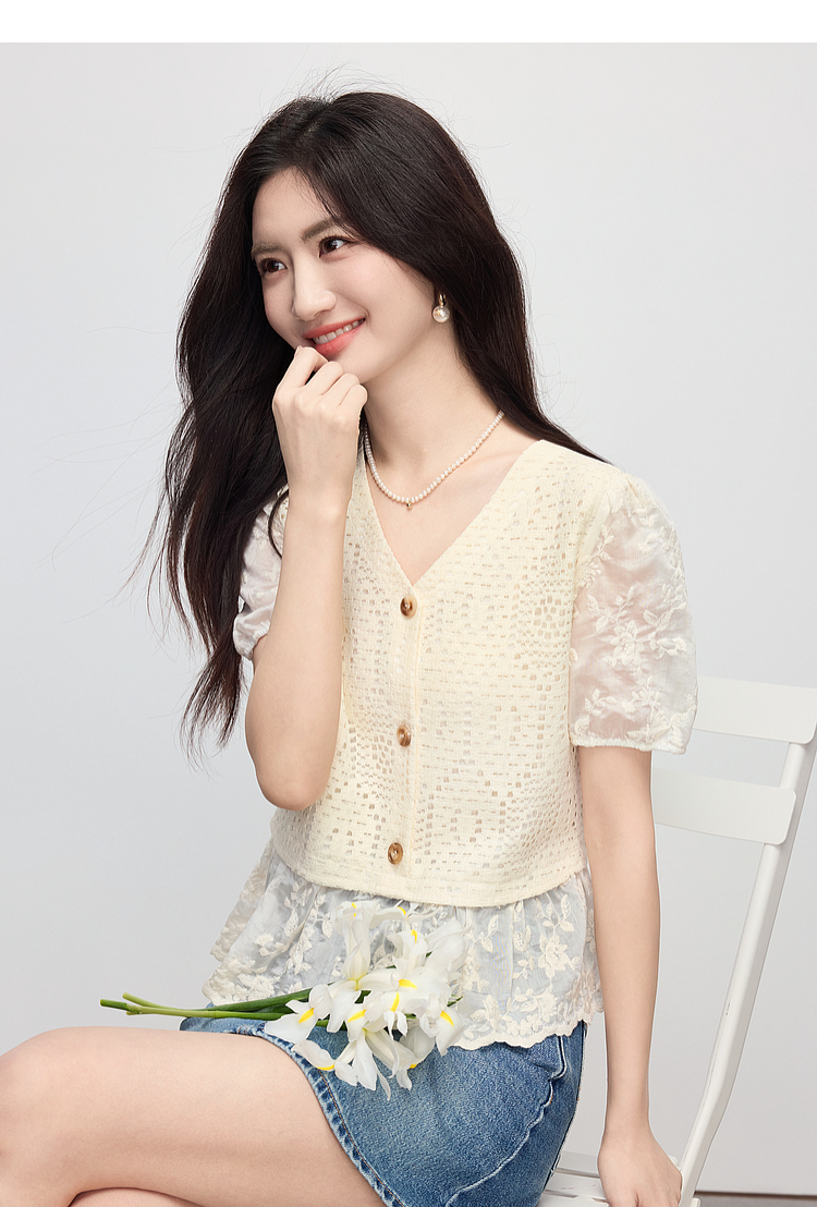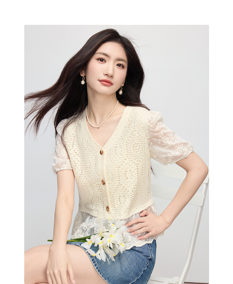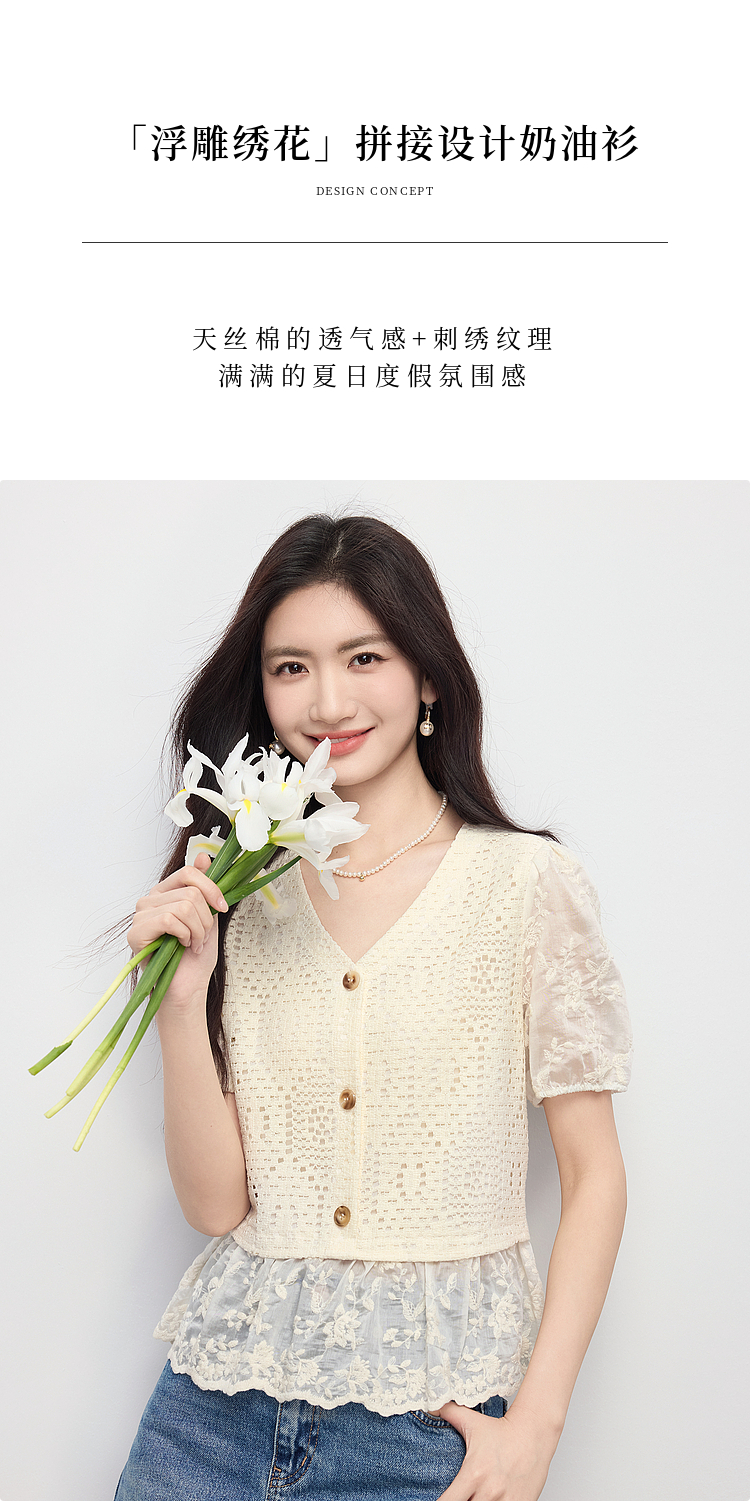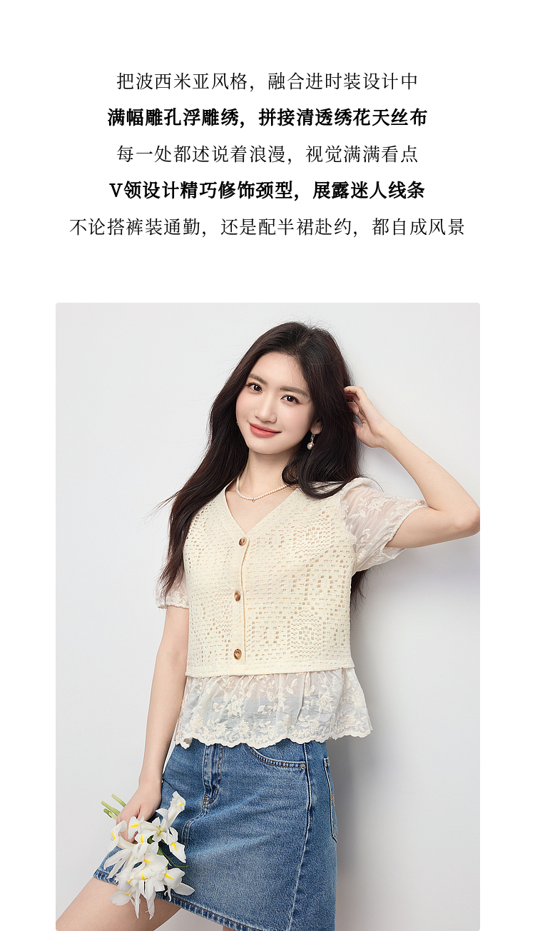 【专属特价】熙世界波西米亚风天丝绣花拼接V领上衣女夏季设计感时尚洋气小衫