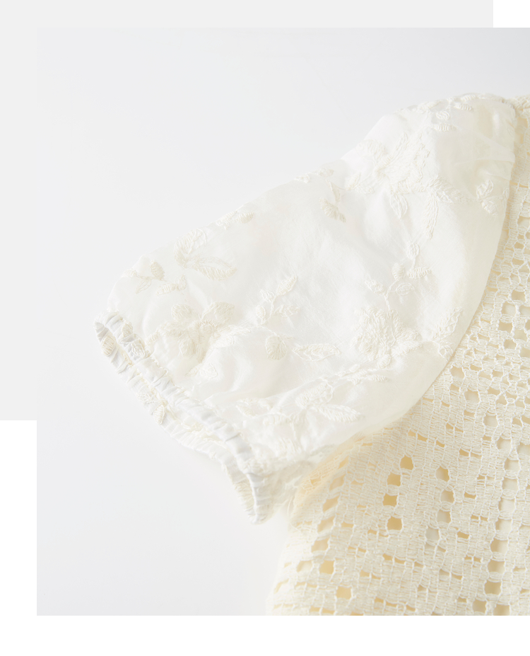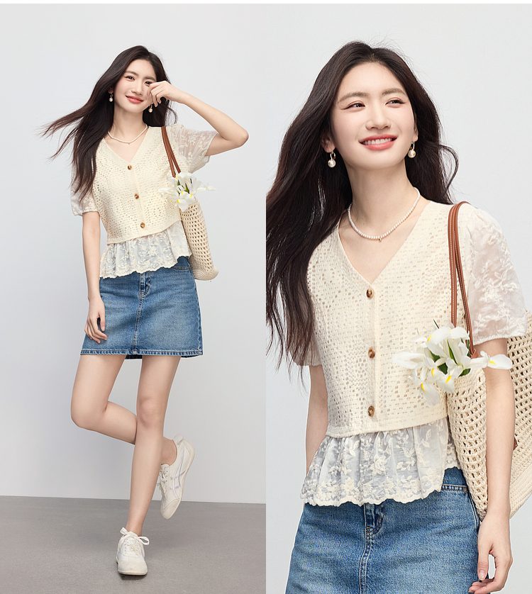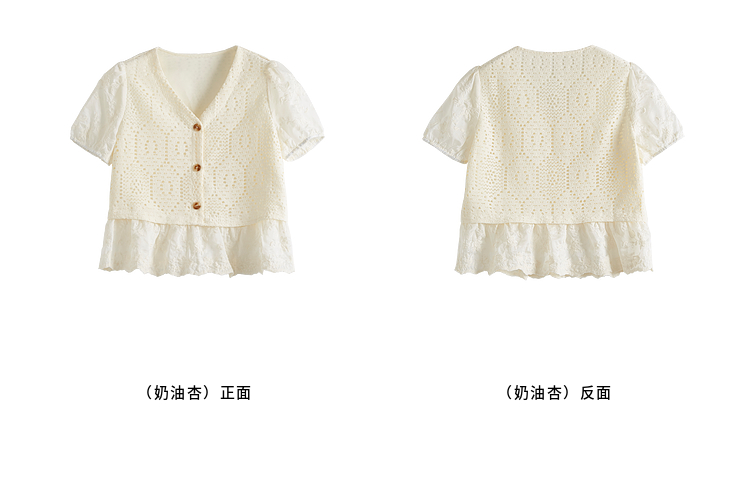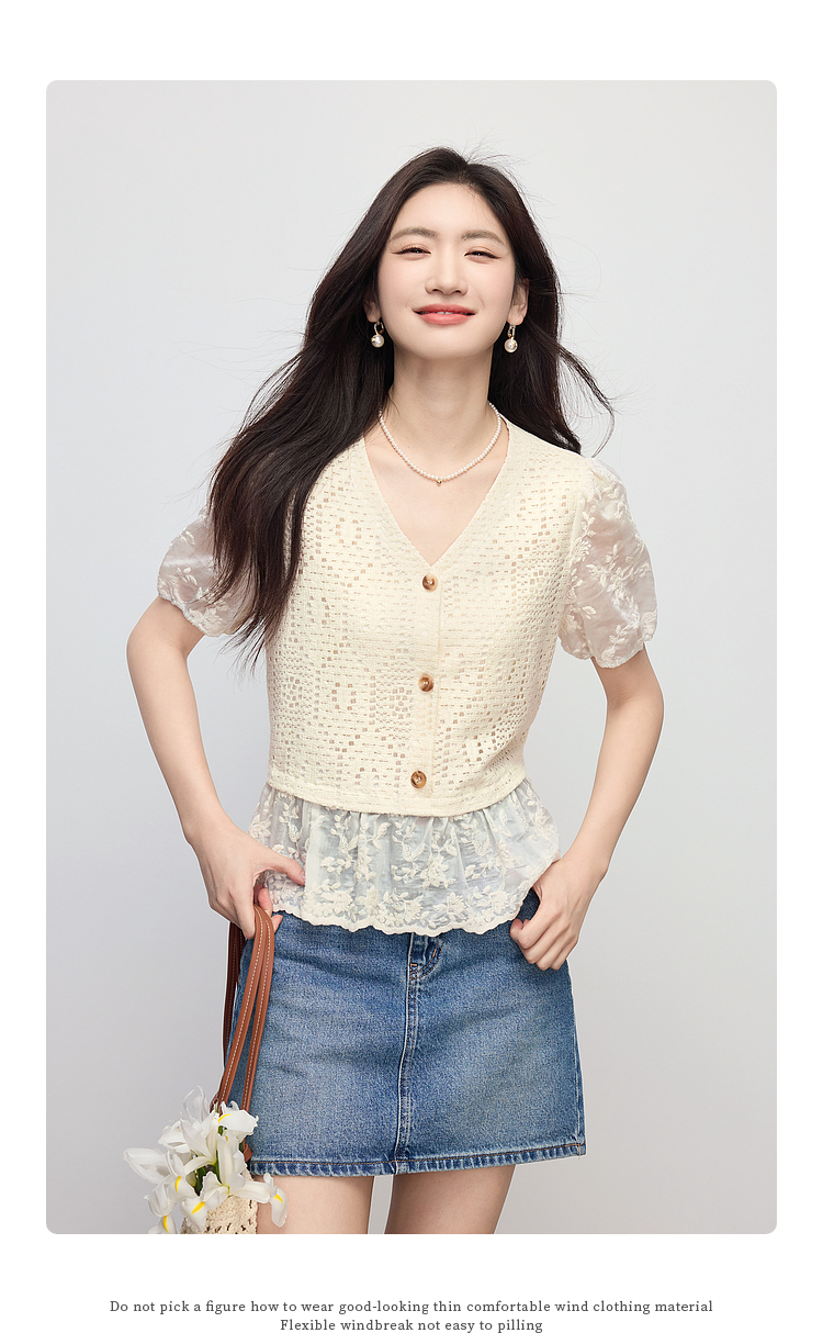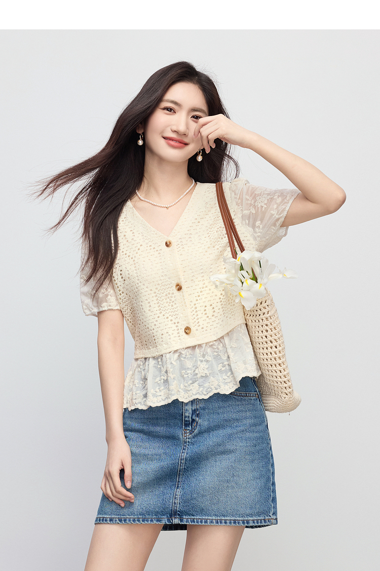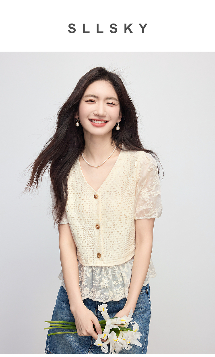 【专属特价】熙世界波西米亚风天丝绣花拼接V领上衣女夏季设计感时尚洋气小衫