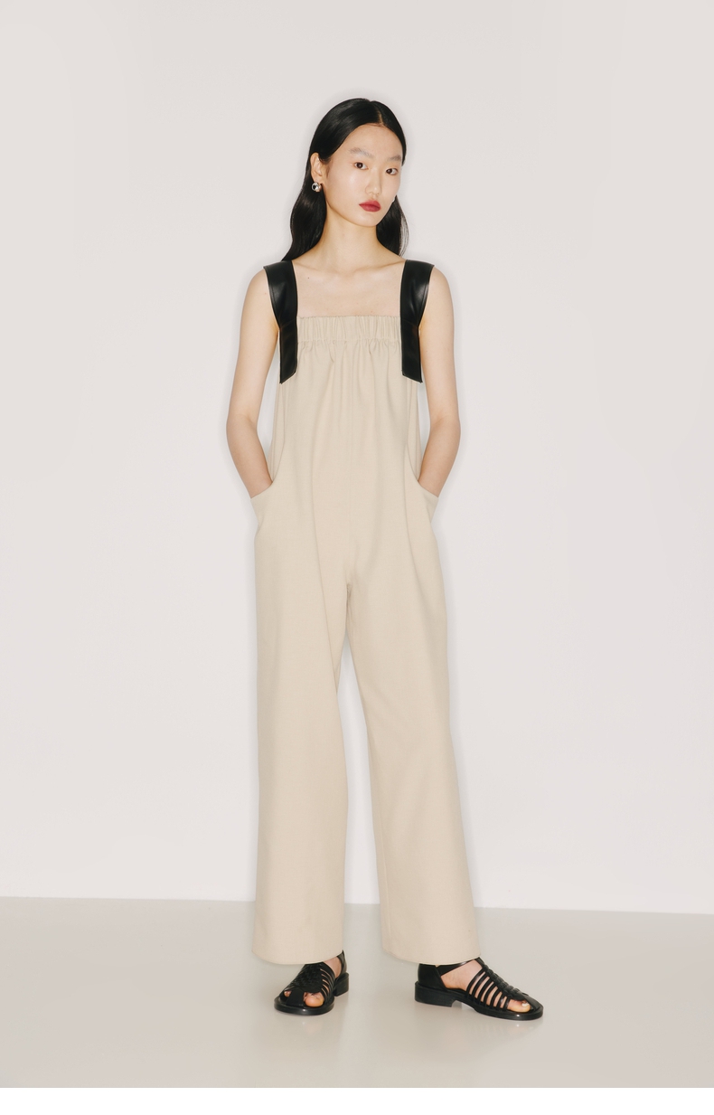 【时髦玛丽奥】环保皮革肩带燕麦浅驼松紧阔腿连体裤/22000001
