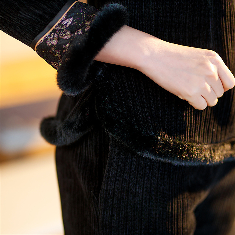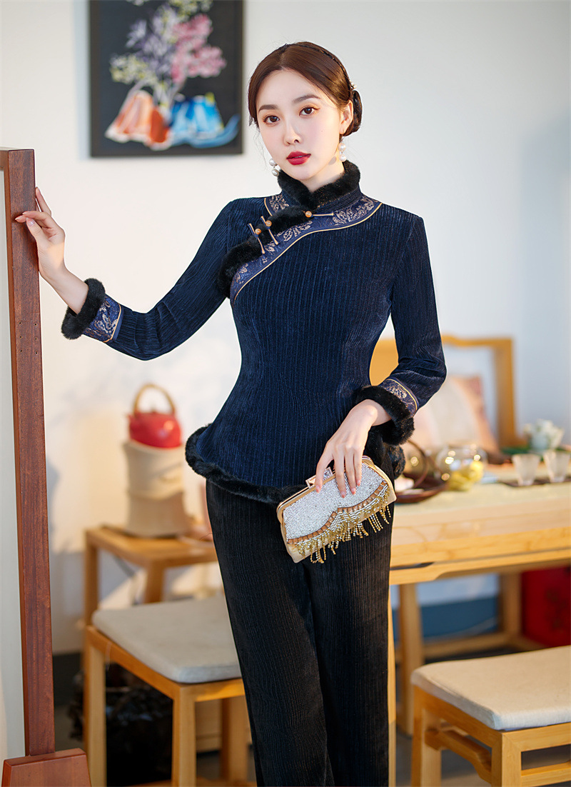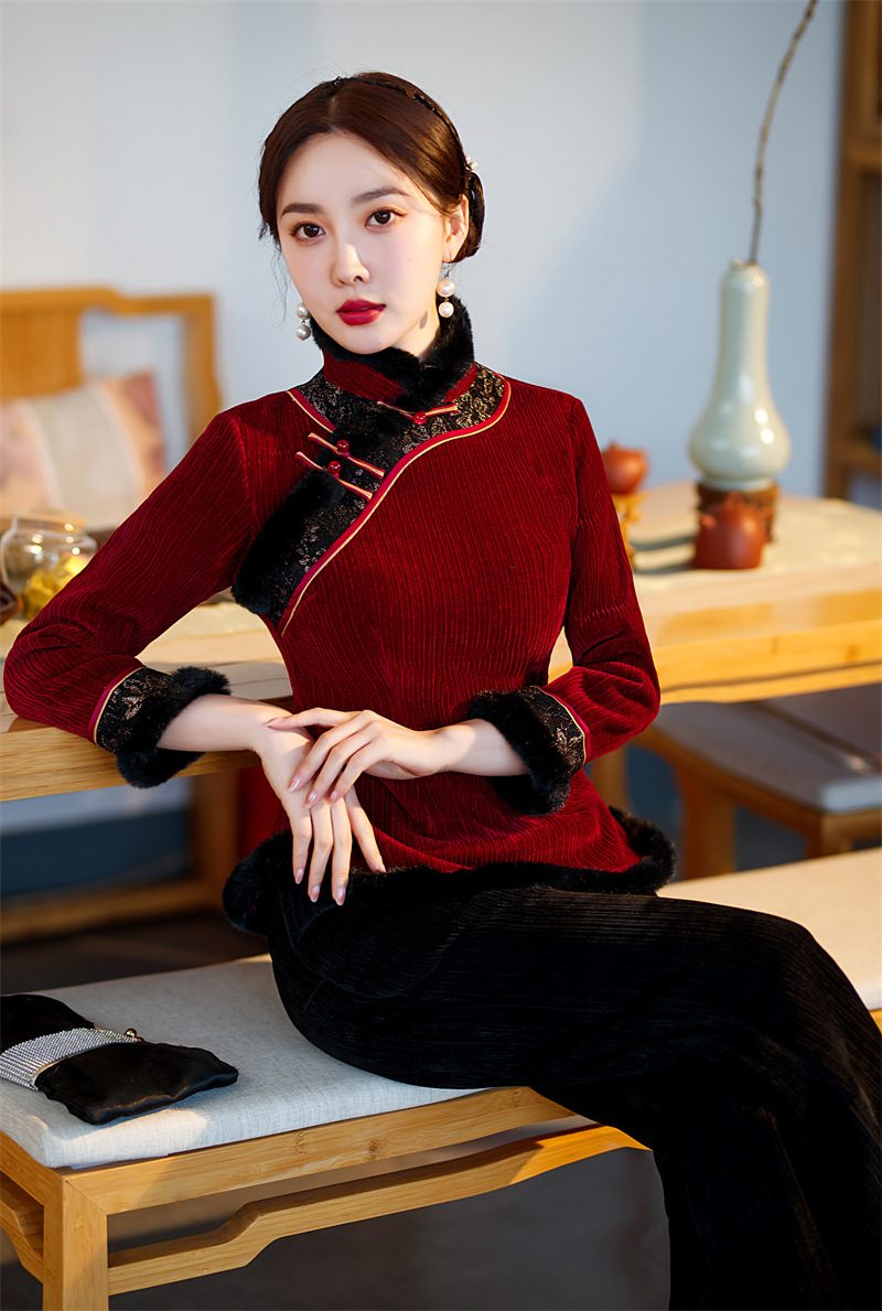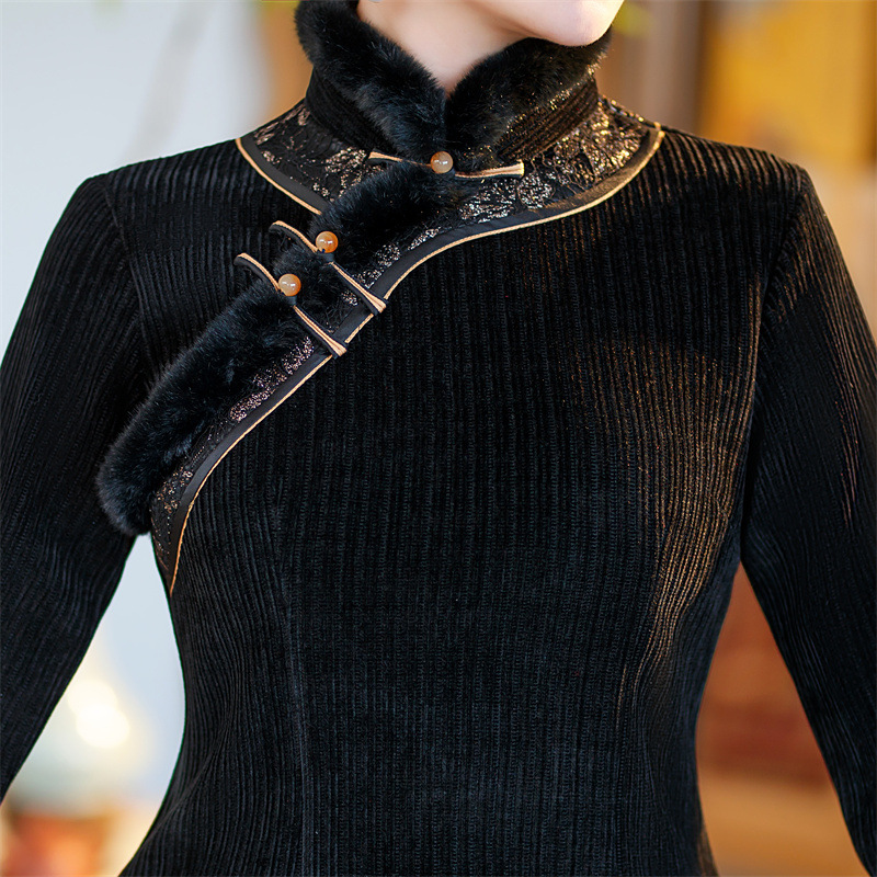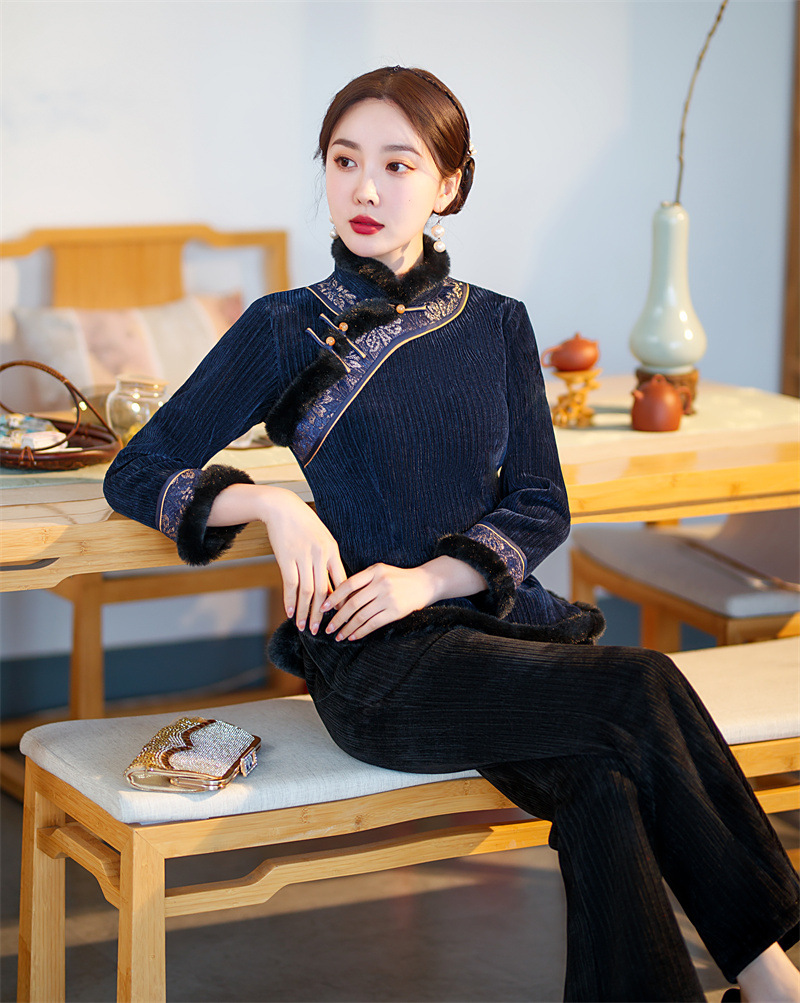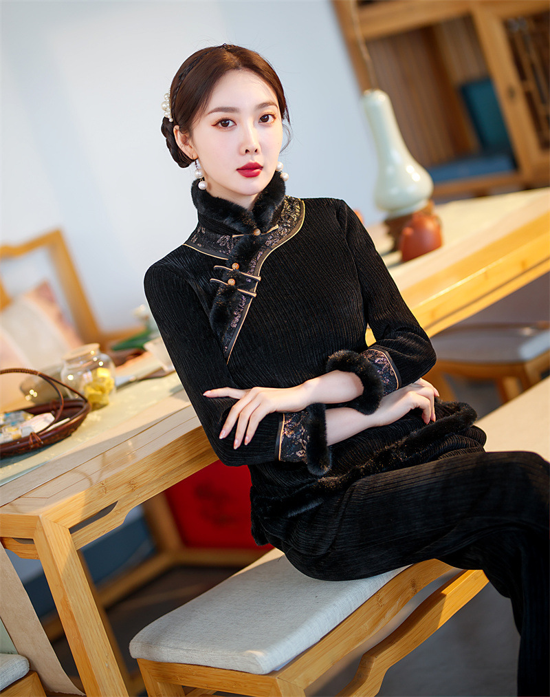 雪尼尔加厚加绒毛领旗袍上衣套装时尚改良旗袍裙GX