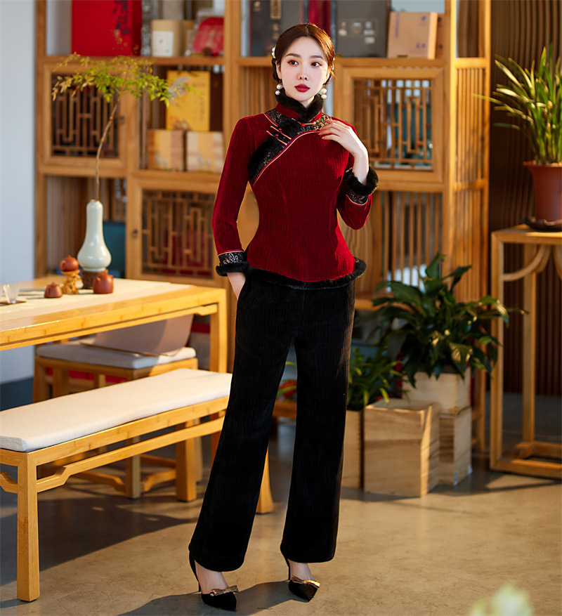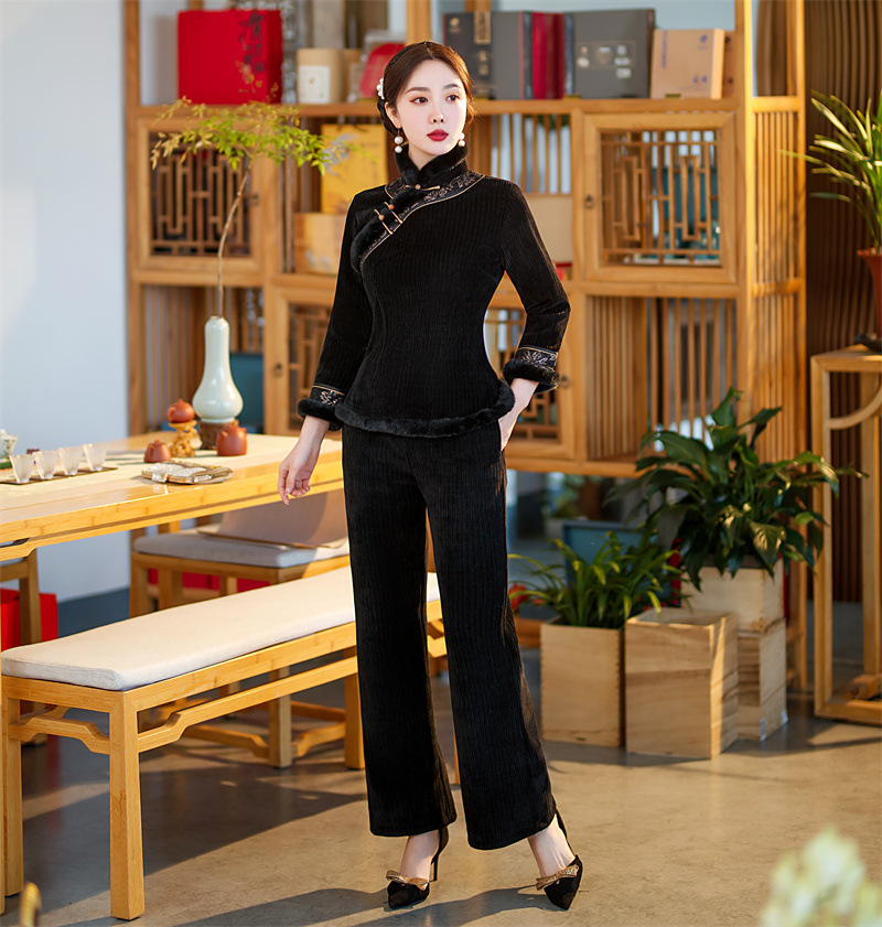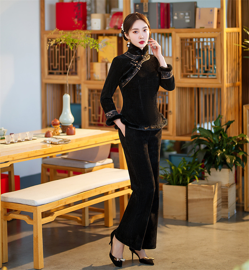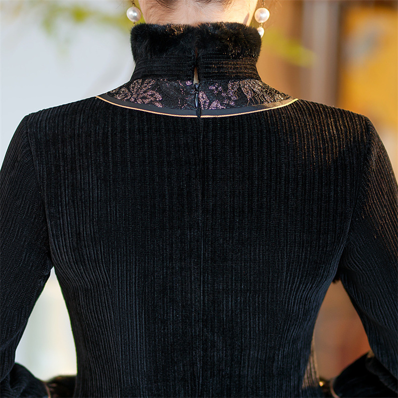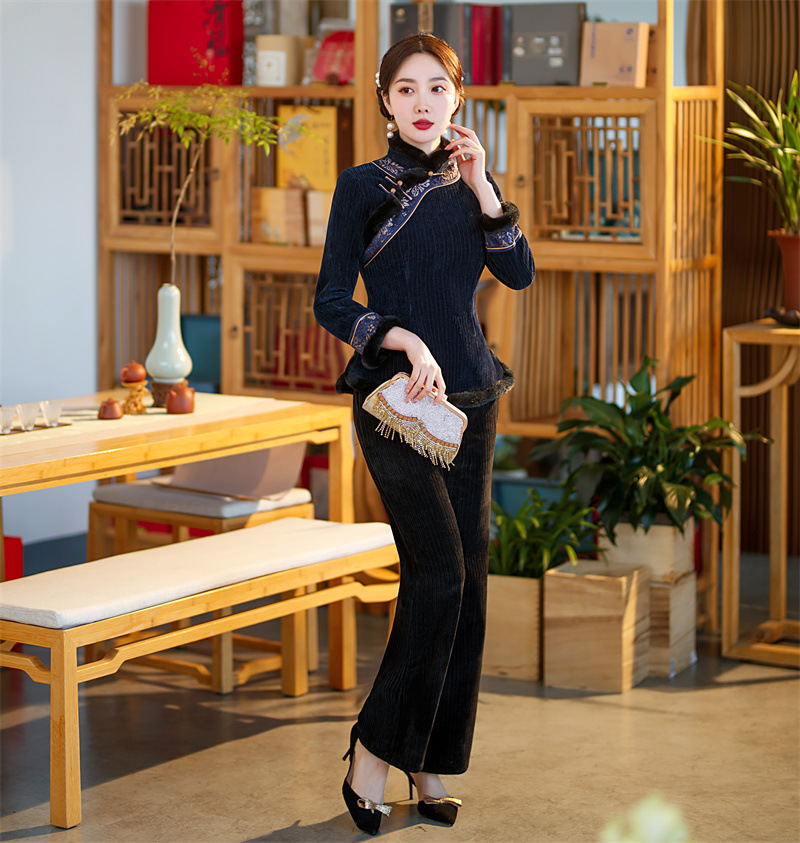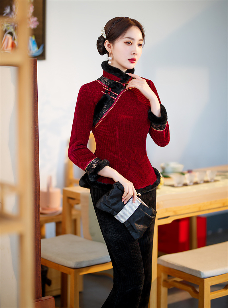 雪尼尔加厚加绒毛领旗袍上衣套装时尚改良旗袍裙GX
