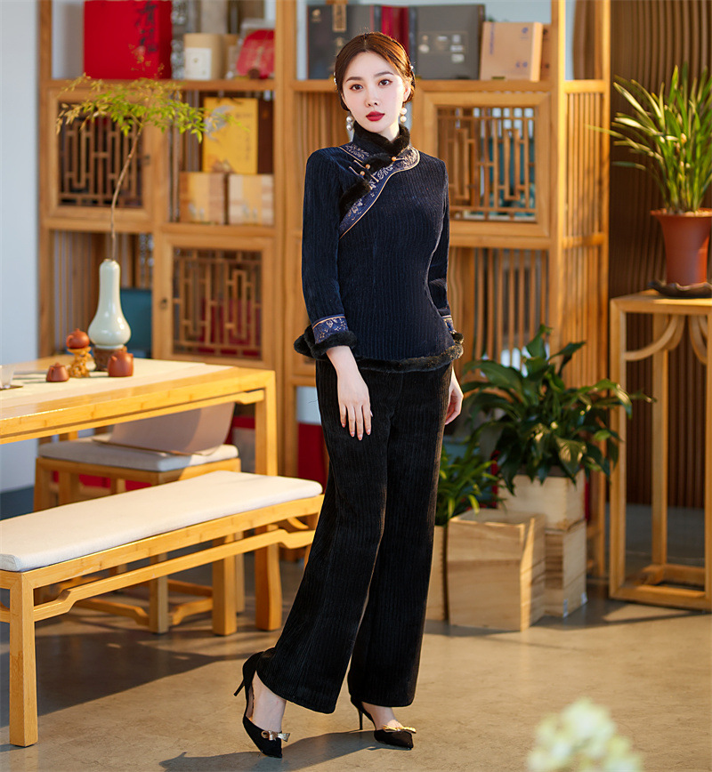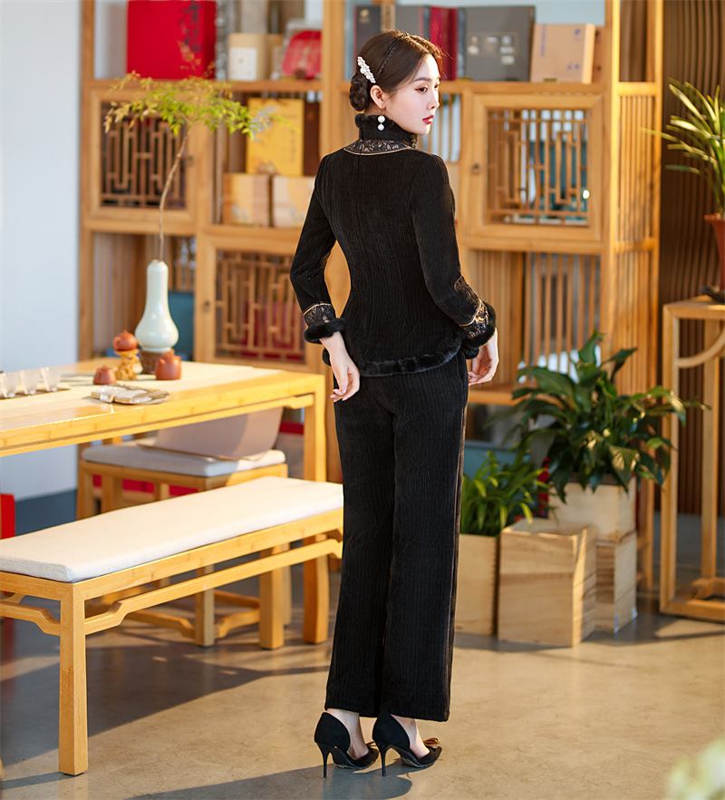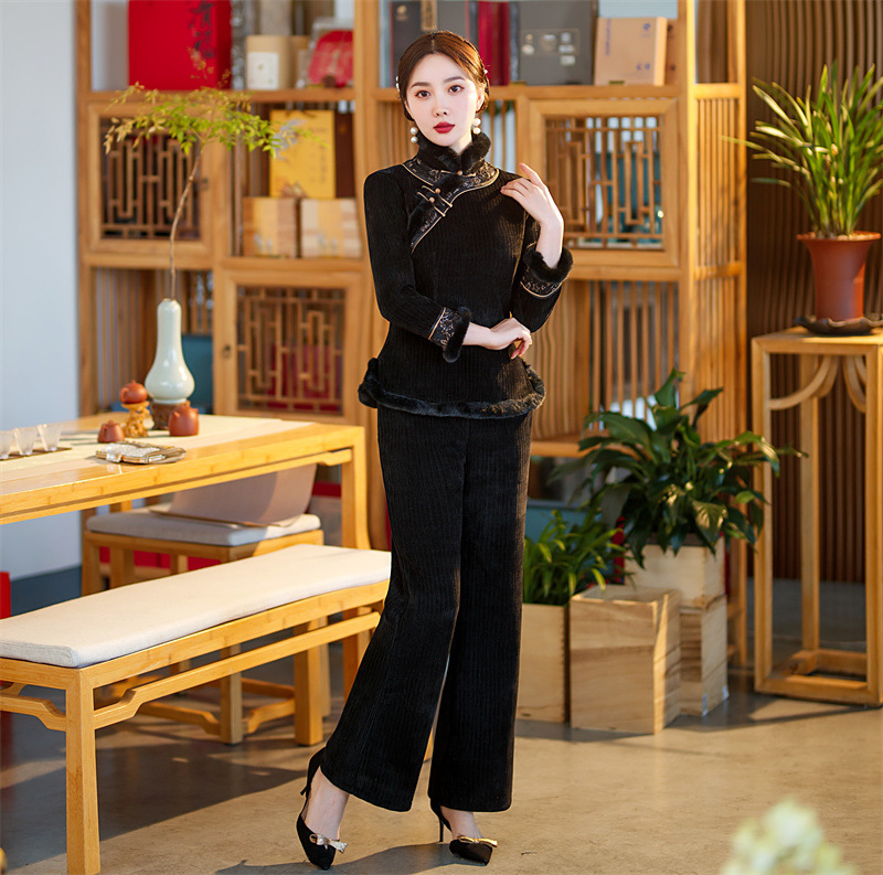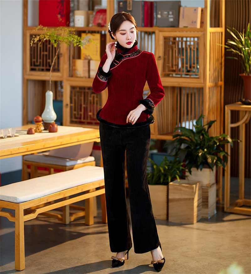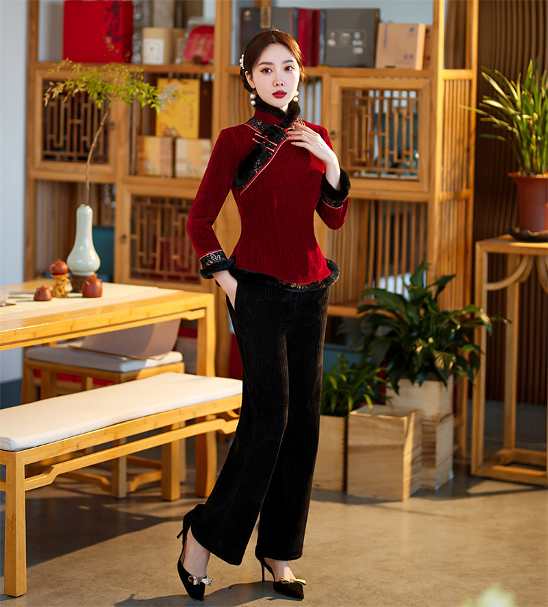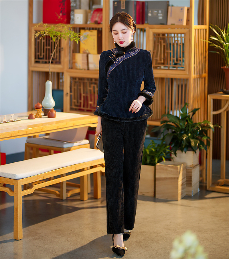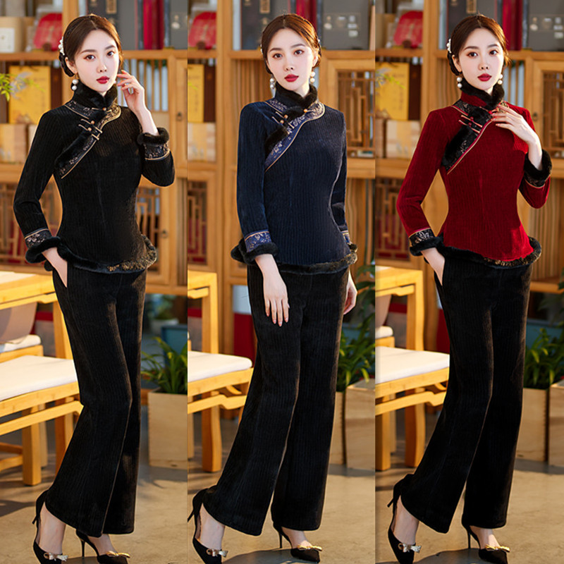 雪尼尔加厚加绒毛领旗袍上衣套装时尚改良旗袍裙GX
