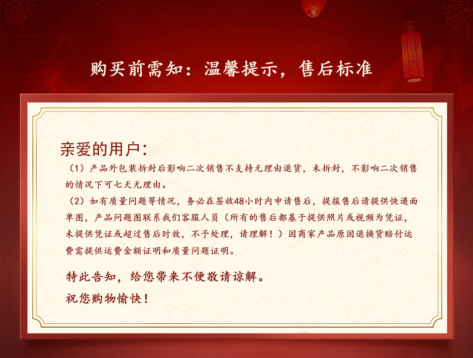 2、快递保存不当导致质量问题,不是售后理由,不在售后范围,售后时效为签收后48小时;
