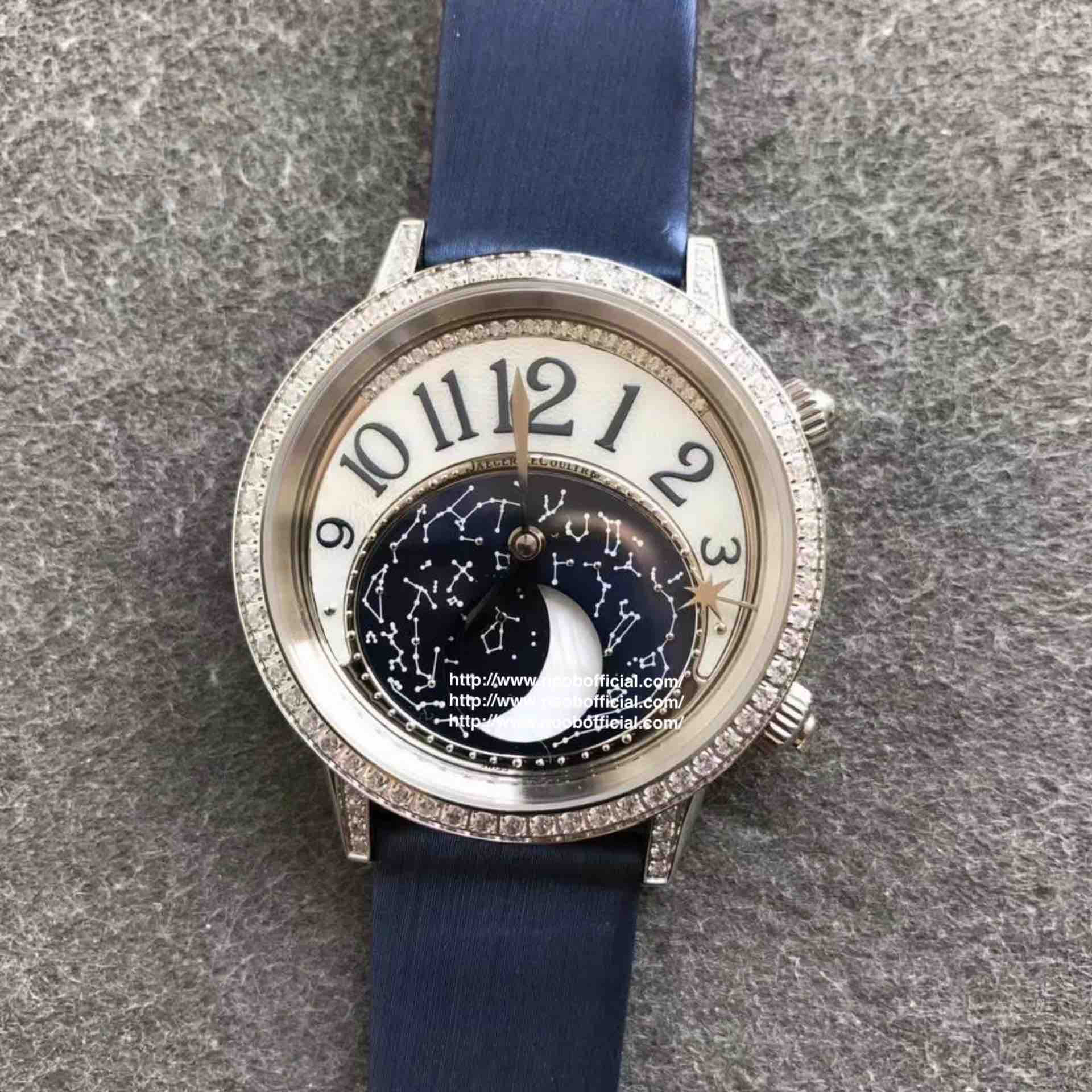 CC新品——绕月之旅 现在出发积家Rendez-Vous Moon Serenity约会系列月相腕表【V2升级修正版】【型号】3522420/480/23490/33490/32490【表壳】腕表尺寸36mmX10.5mm,镶嵌208颗顶级施华洛世奇闪钻,v2版修正圈口中壳底盖等各处细节,更精致圆润自然。【表盘】饰以精美扭索饰纹和镶满钻石的表盘相辅相成共同散放着星空一般的璀璨光芒,搭配一枚星形指针以最富诗意的方式,提示佩戴者约会的时间,珍珠贝母月相在星图映衬下尽现柔美【机芯】升级CITIZEN9015改全进口CAL.935A机芯,夹板打磨更细腻,功能走时更稳定可靠【表带扣】意大利牛皮质感柔软,搭配原装折叠扣