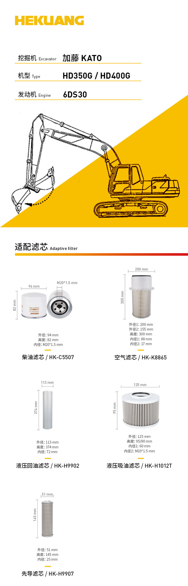 加藤HD350G HD400G(6DS30)挖掘机滤芯 机油柴油空气滤芯 液压油先导滤芯