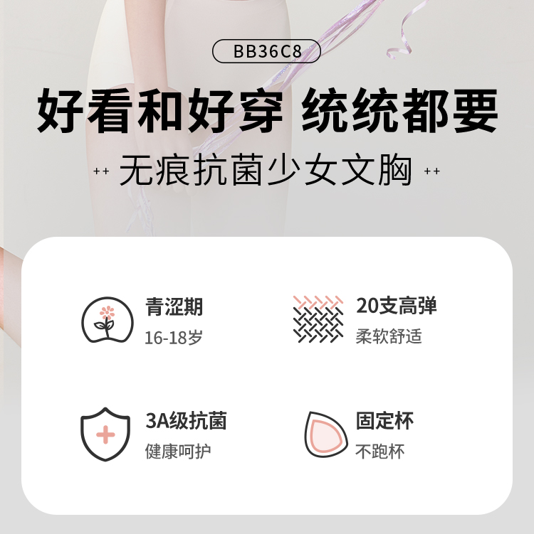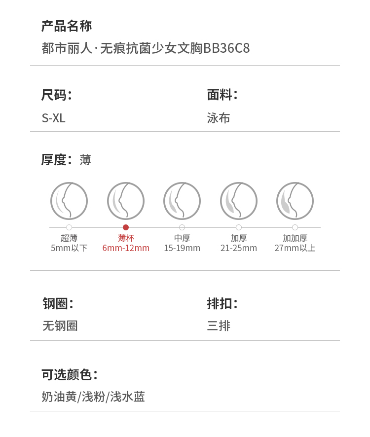 都市丽人少女三步优选内衣无尺码薄3/4杯泳布文胸三排无钢圈BB36C8