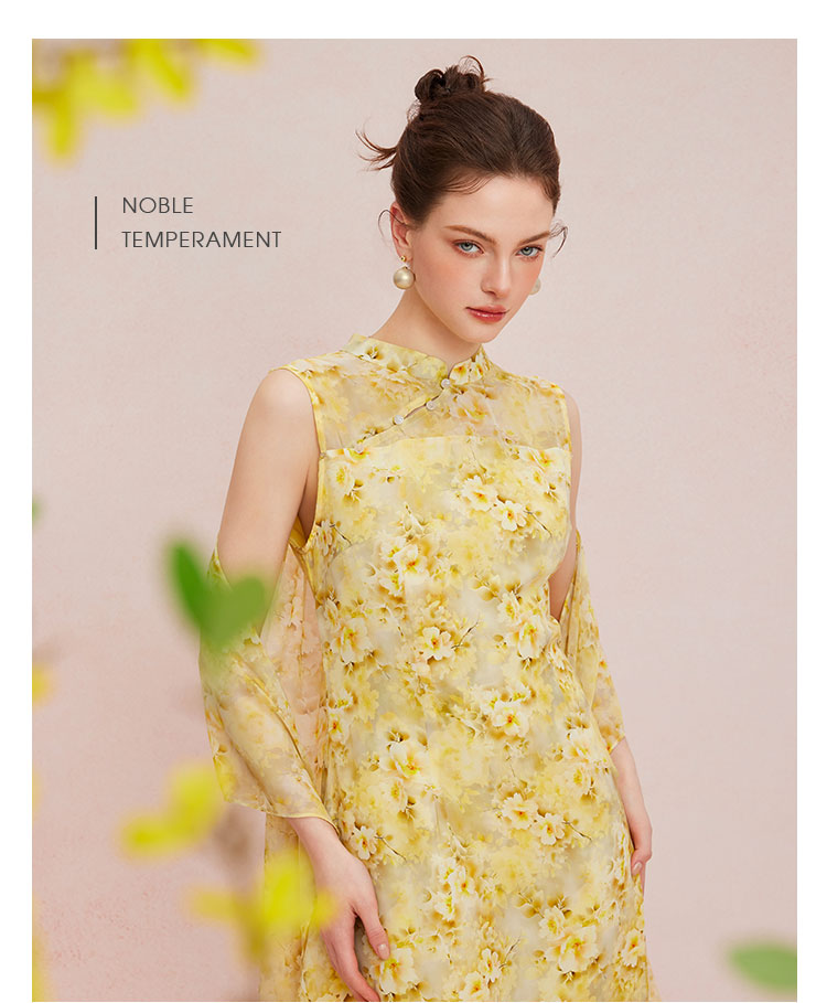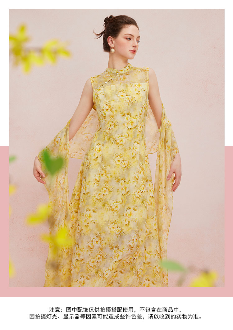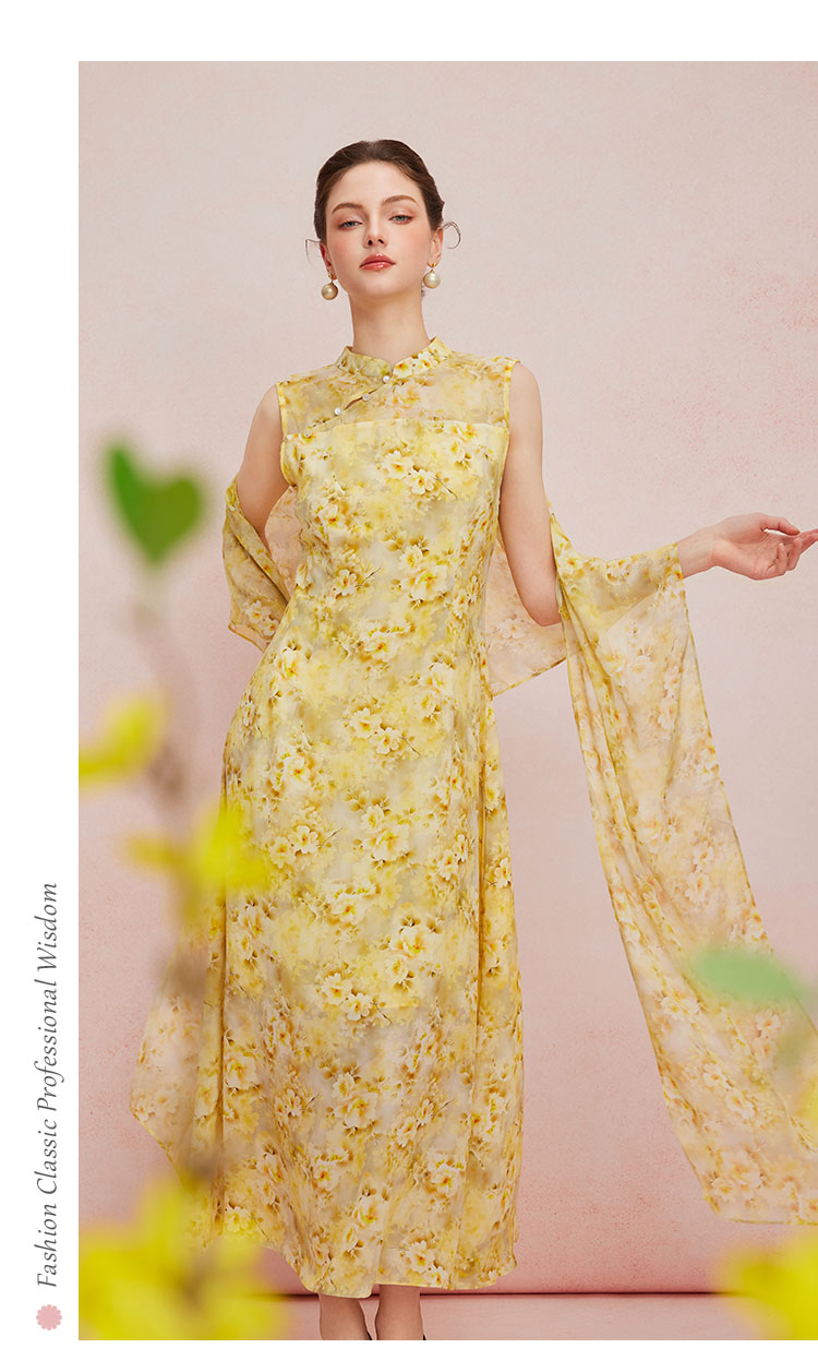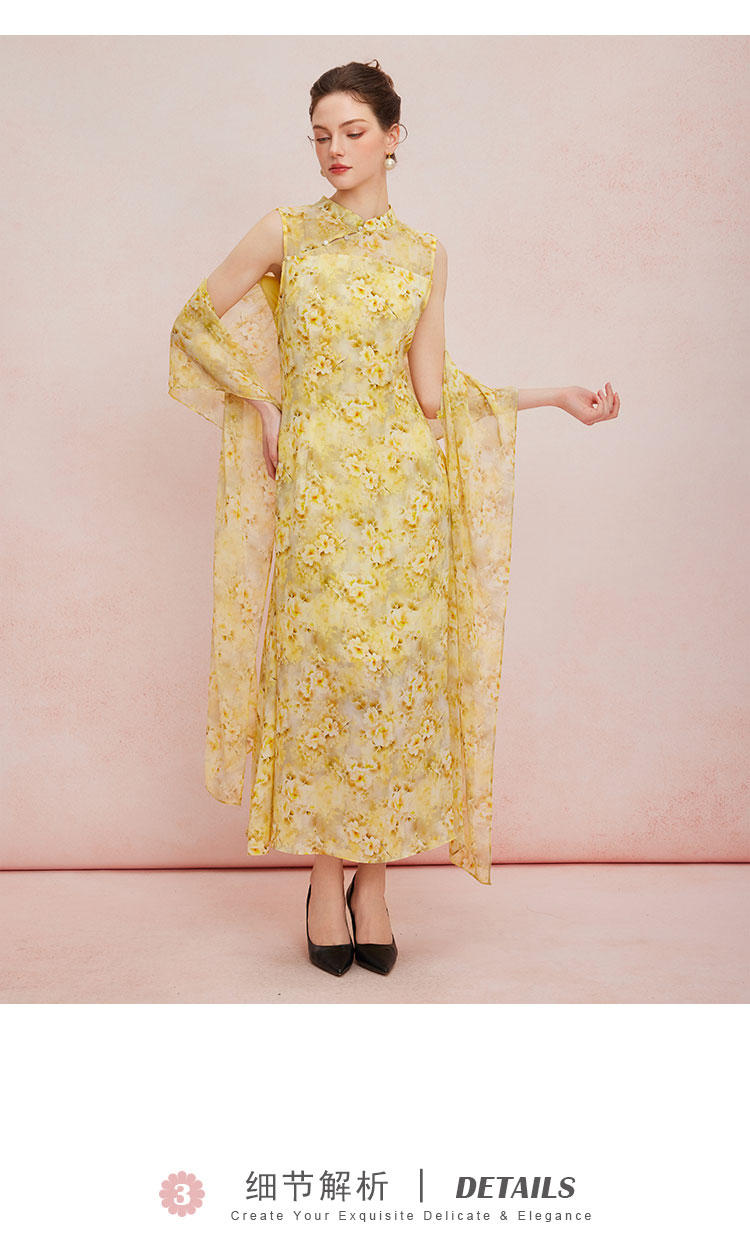 QF888斯尔丽2025新款法式浪漫轻奢印花改良旗袍薄纱多样穿搭披肩连衣裙