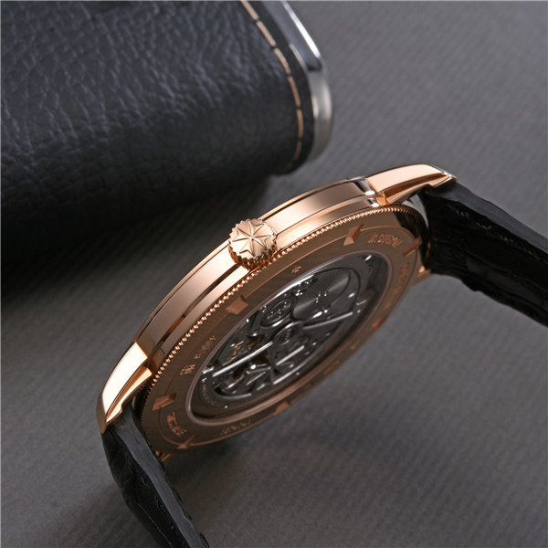 镜面材质 | 蓝宝石水晶玻璃 | 表盘 | 18K 5N粉红金表壳 乳光墨褐色表盘,18K 5N粉红金时标 指针 背透,透明蓝宝石水晶表底盖 |