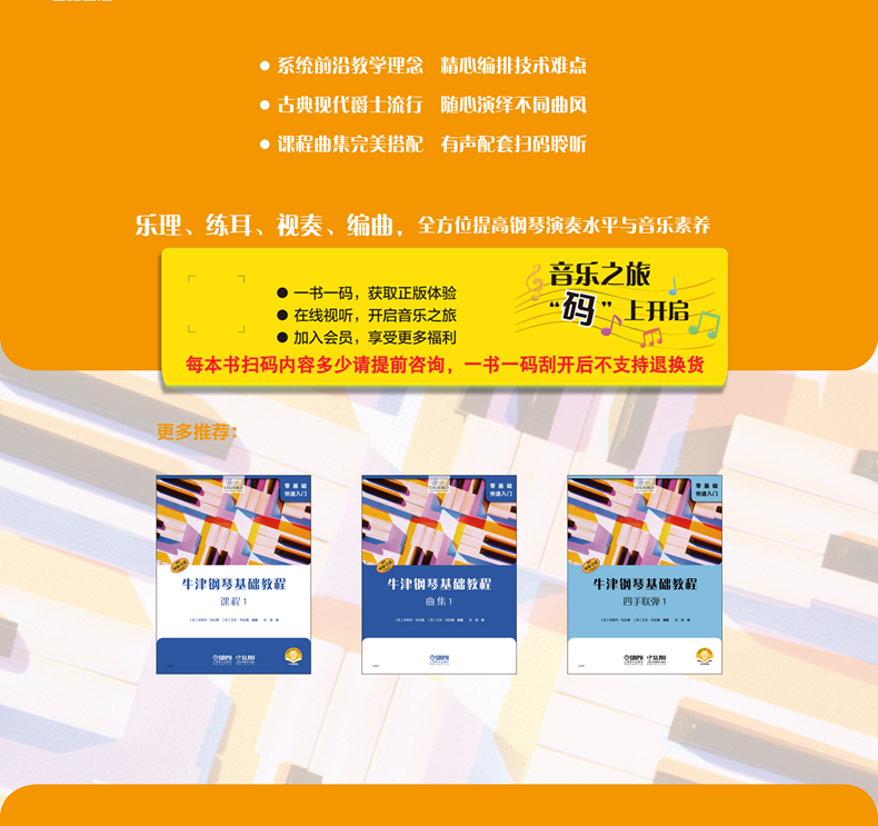 本套《牛津钢琴教程》是由英国牛津大学出版社出版的钢琴学习教程,旨在帮助学生快速掌握钢琴演奏技巧,同时注重培养学生用耳朵去学习钢琴演奏以及学生即兴演奏的能力。本套教材旨在为学生们提供一种更为成人式的学习方法,快速上手钢琴演奏。让想要进行简单钢琴表演或边弹边唱的学习者可以最快弹上自己喜爱的乐曲。全系列共有六本图书,通过演奏乐曲与合奏培养学生的钢琴演奏兴趣以及对音乐的理解。本套装为第2级别,由“课程2”“曲集2”“四手联弹2”三本图书组成。