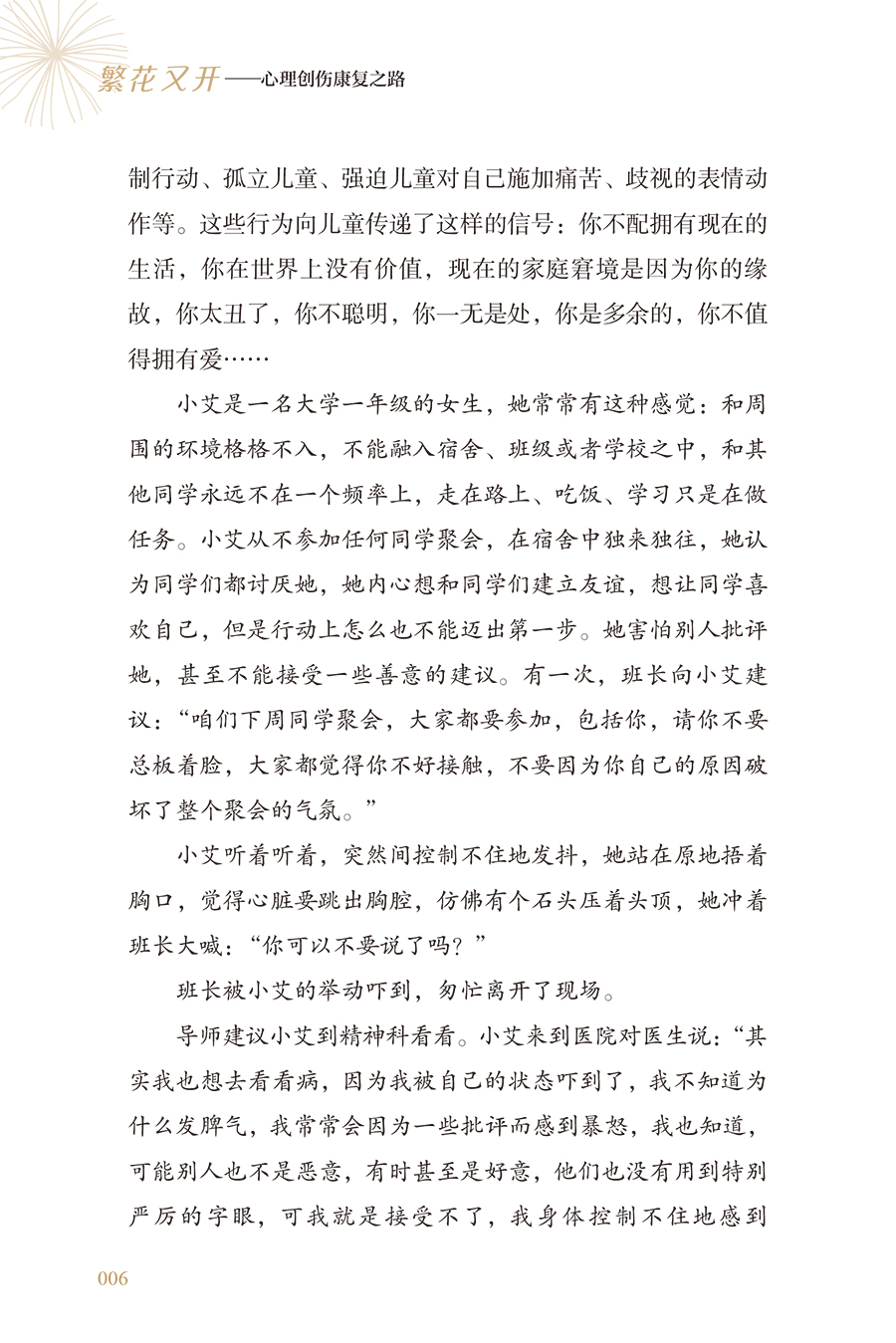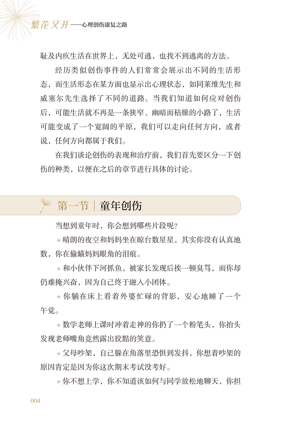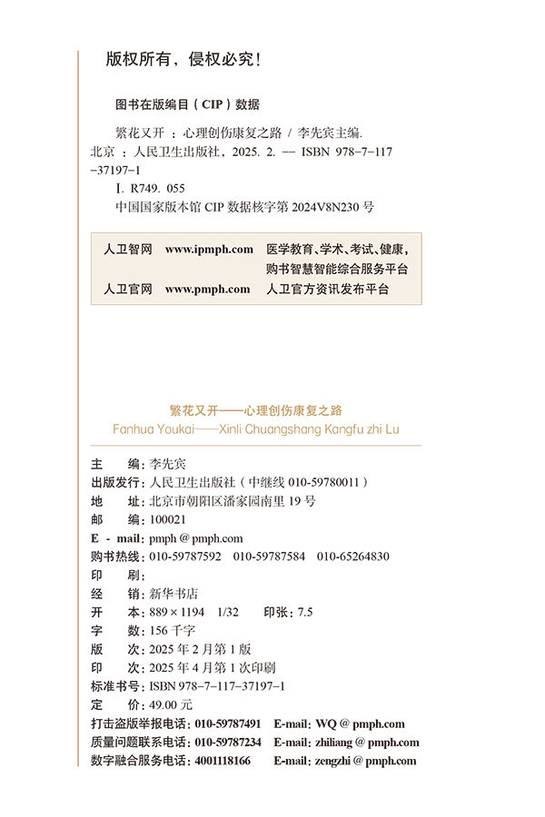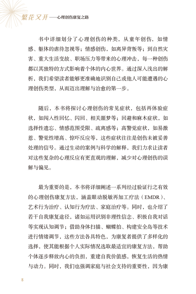 繁花又开 心理创伤康复之路 李先宾 本书系统地介绍心理创伤的多维度面貌 包括其种类 症状表现以及科学的康复方法 人民卫生出版社