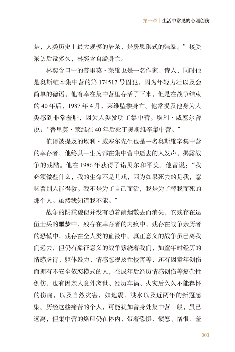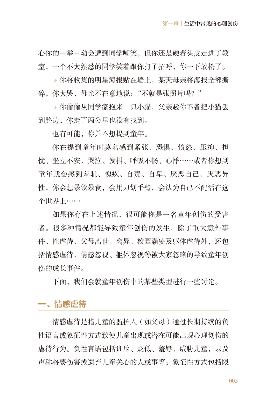 本书是以临床真实的典型案例为载体,通过对真实案例的描述与讲解,完成对心理创伤基本类型、心理精神症状、发病机制、个体心理保健技术以及心理创伤的专业治疗等方面知识的科学普及。全书分为第一章 凝望深渊——临床上常见的心理创伤;第二章 深渊的回望——症状与发病机制;第三章 悬崖边的防护网——心理健康保健技术;第四章 请抓住这根绳子——创伤的疗愈;第五章 在深渊中仰望天空——感言篇。通过叙事化的语言、栏目化的内容构架,让患者重拾自我、让大众了解自己。