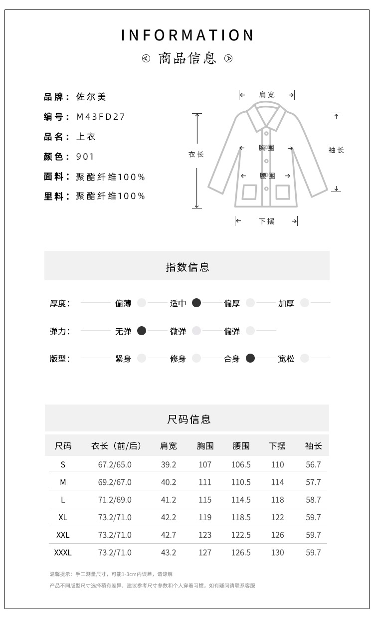 佐尔美新品秋冬新品薄纯色简约时尚妈妈装女外套E73FZ09