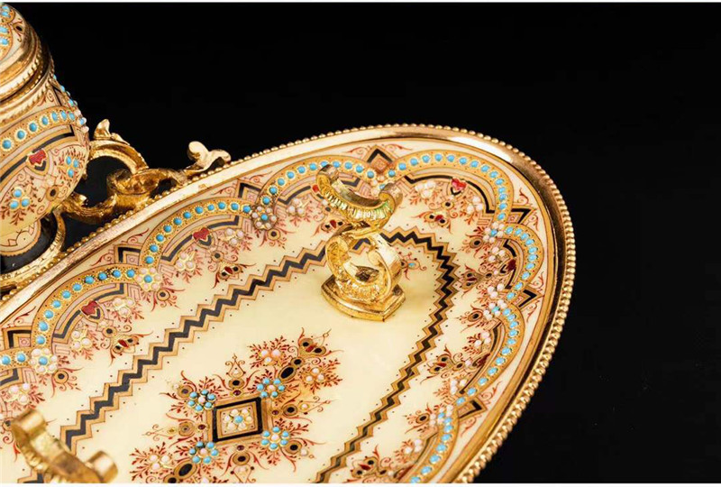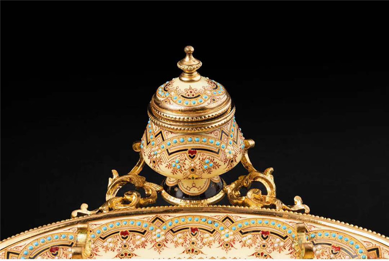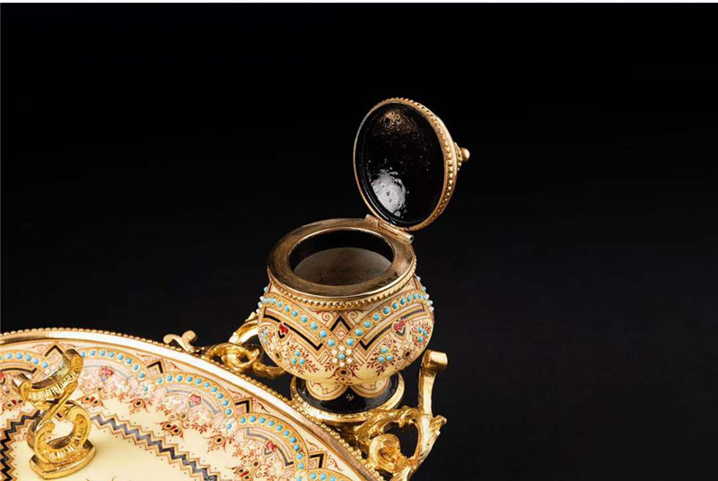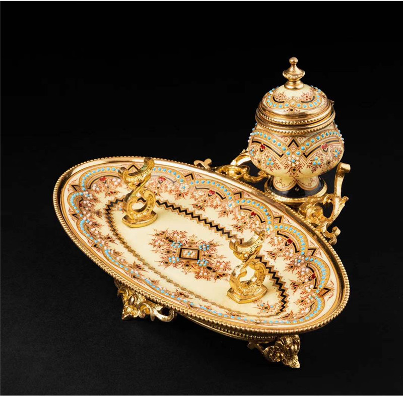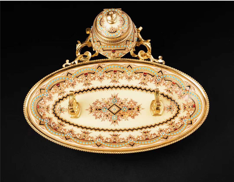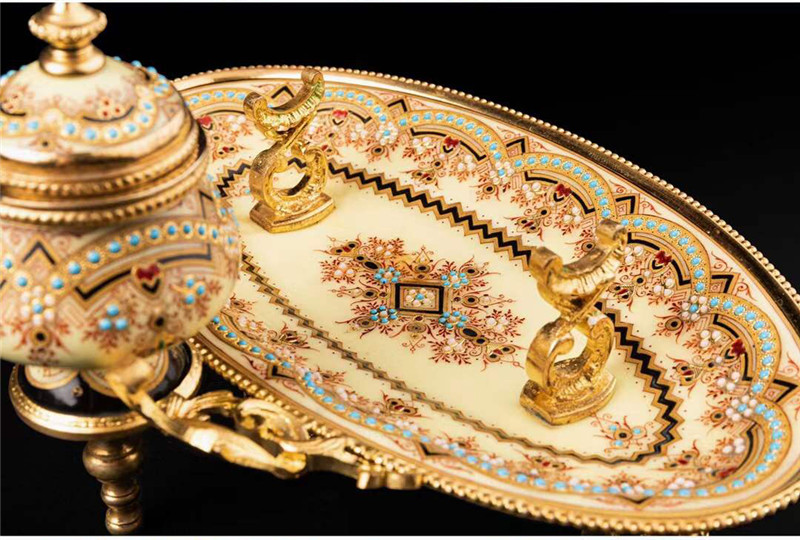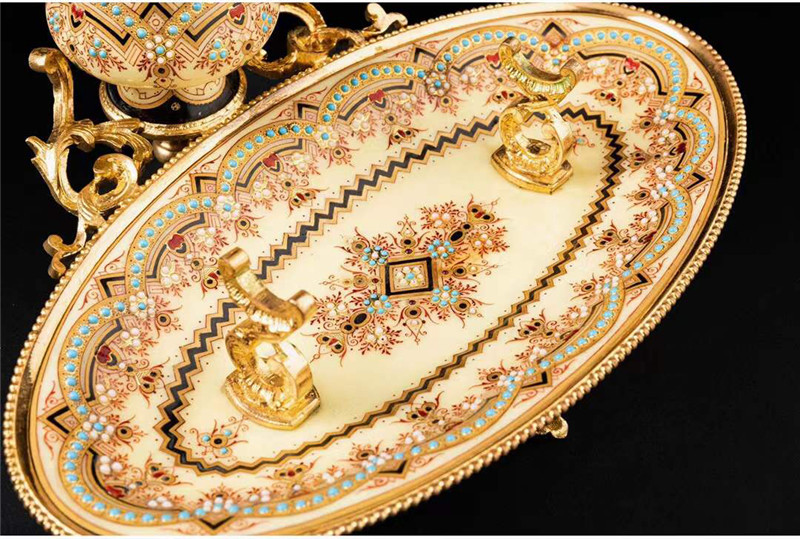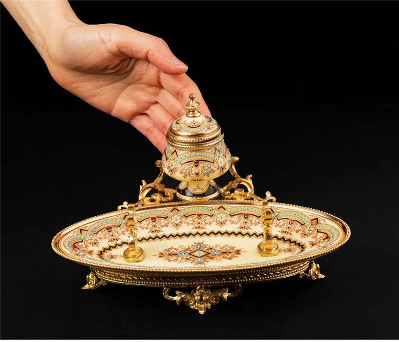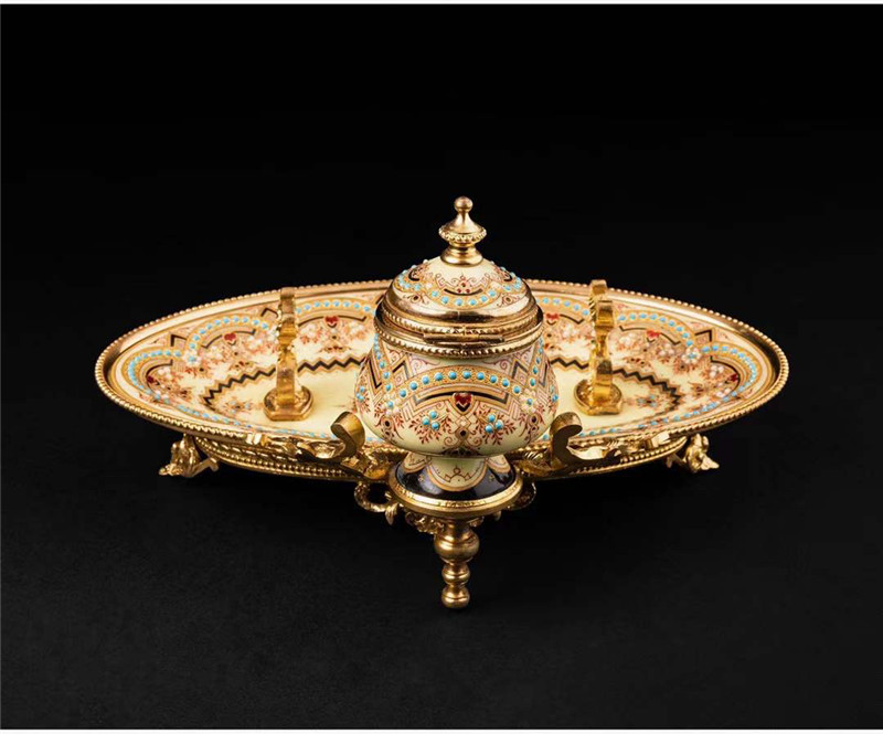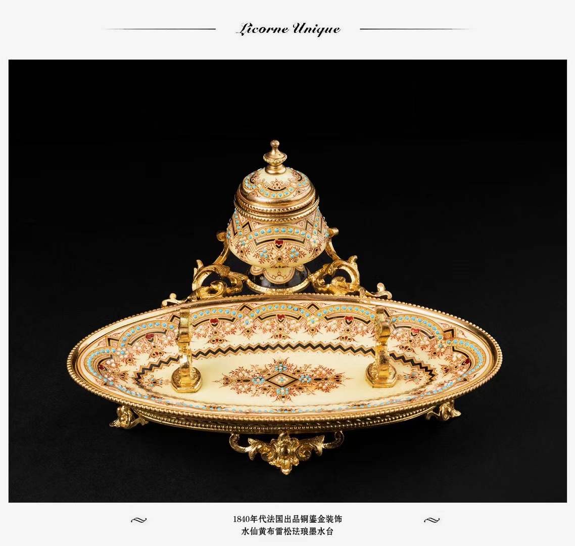 独角鹿西洋古董1840年代法国铜鎏金装饰水仙黄布雷松珐琅墨水台