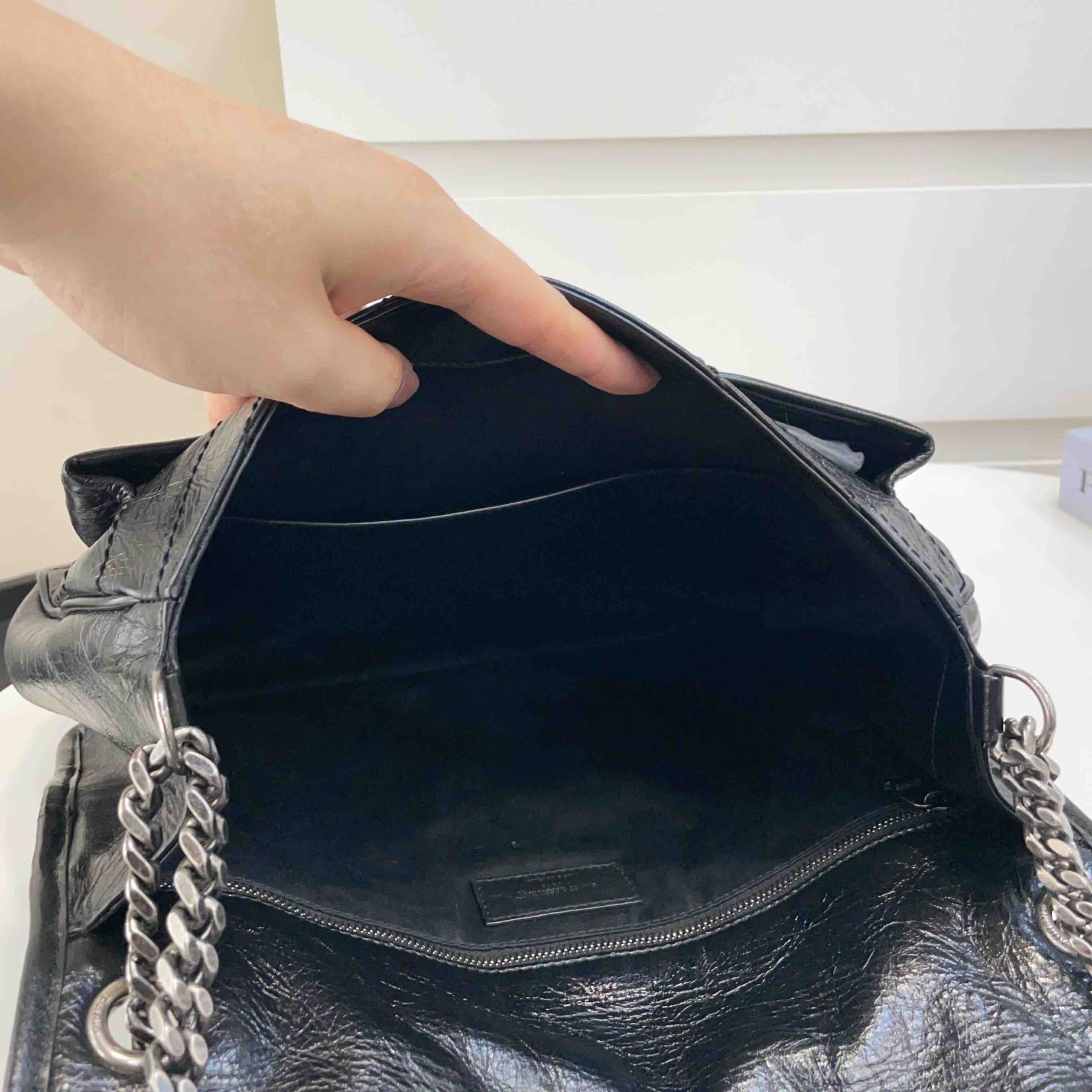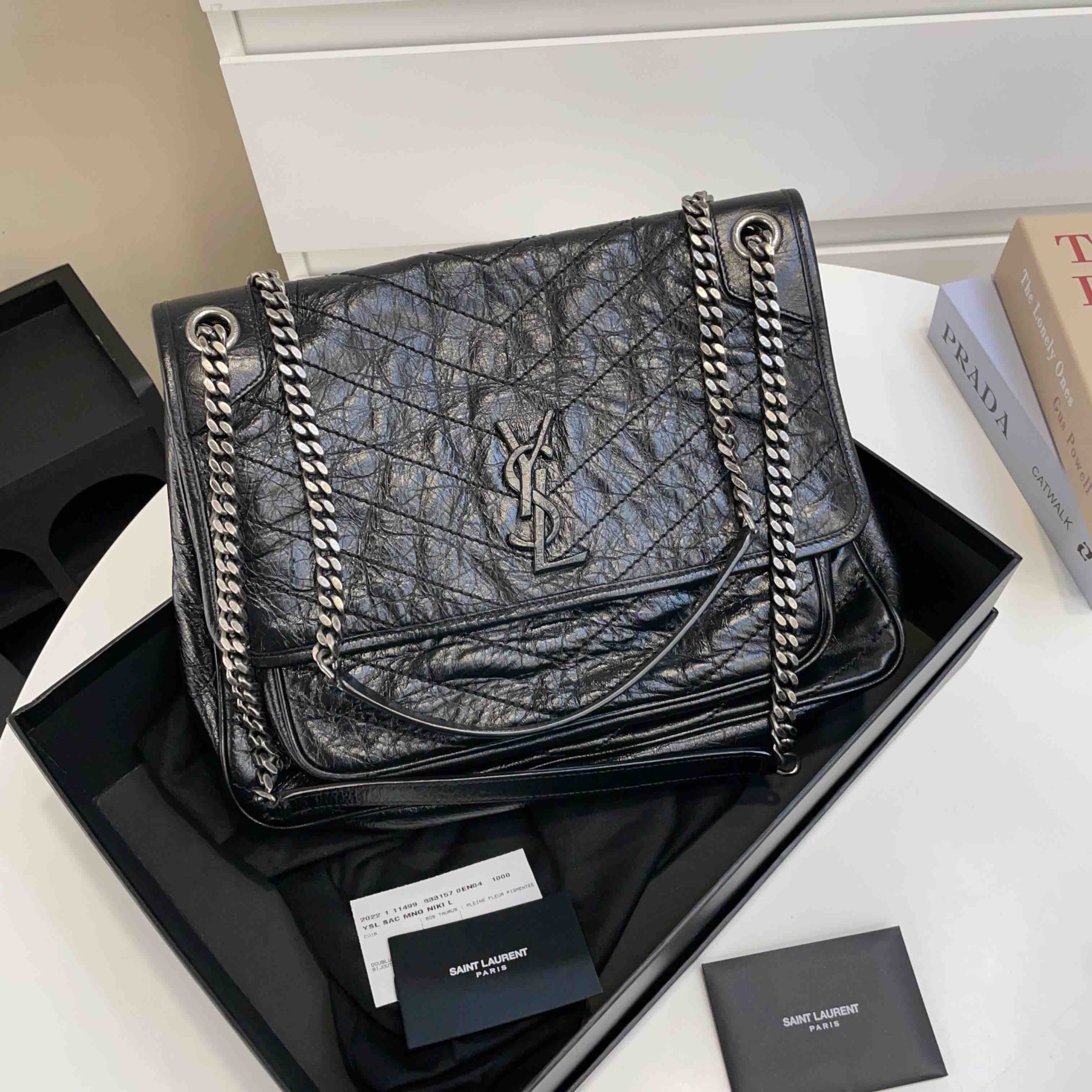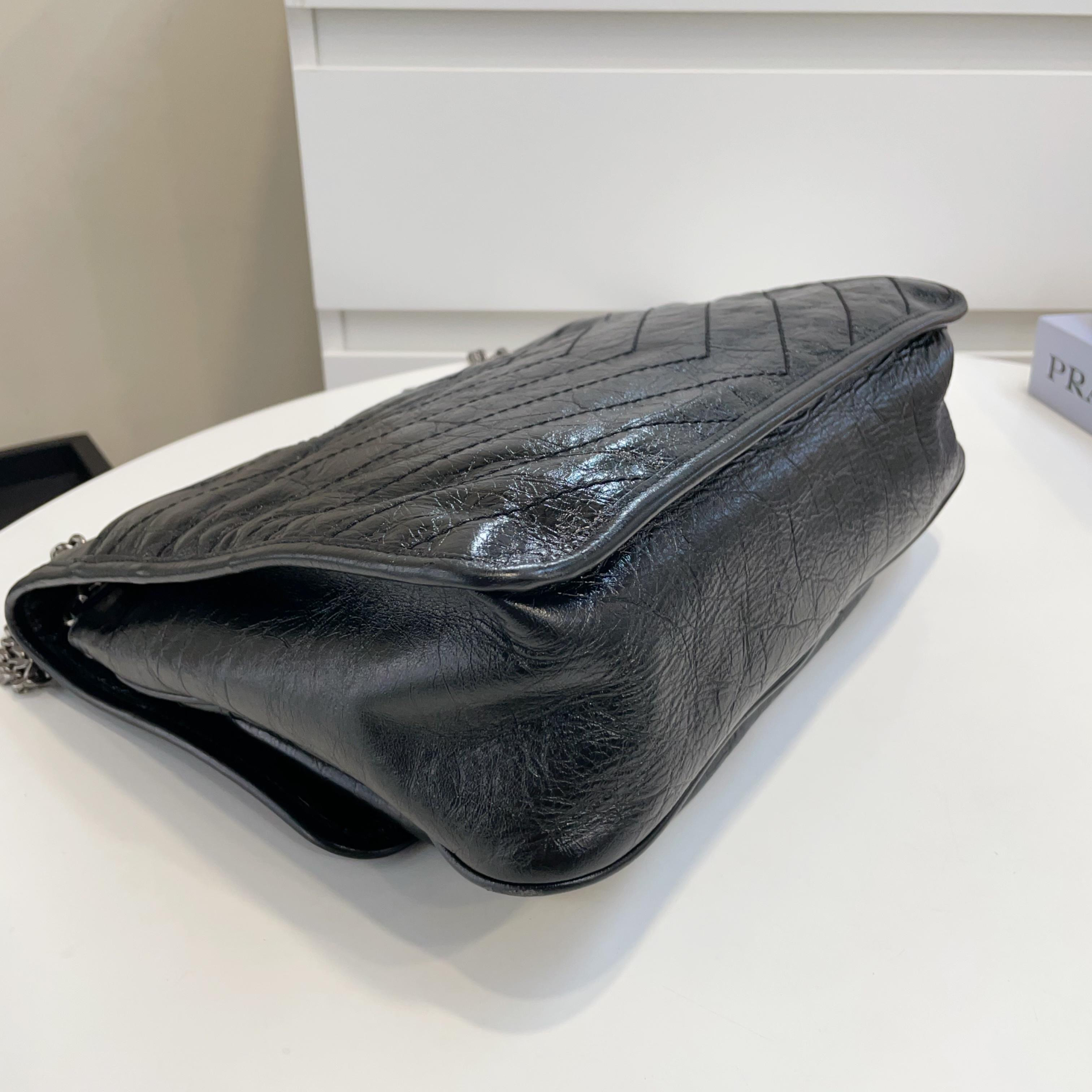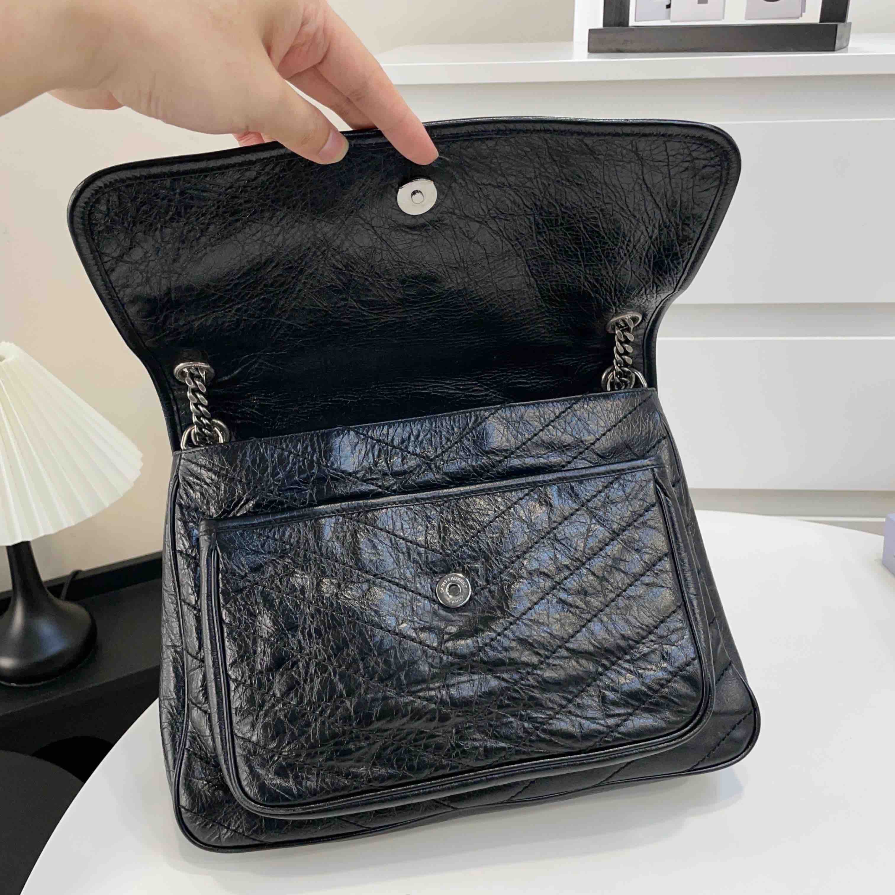 【商品描述】正品二手 YSL 黑色 油蜡牛皮 大号 Niki 斜挎包🍓 97新 32x26 配件:盒、防尘袋、说明书边角和logo扣轻微磨损