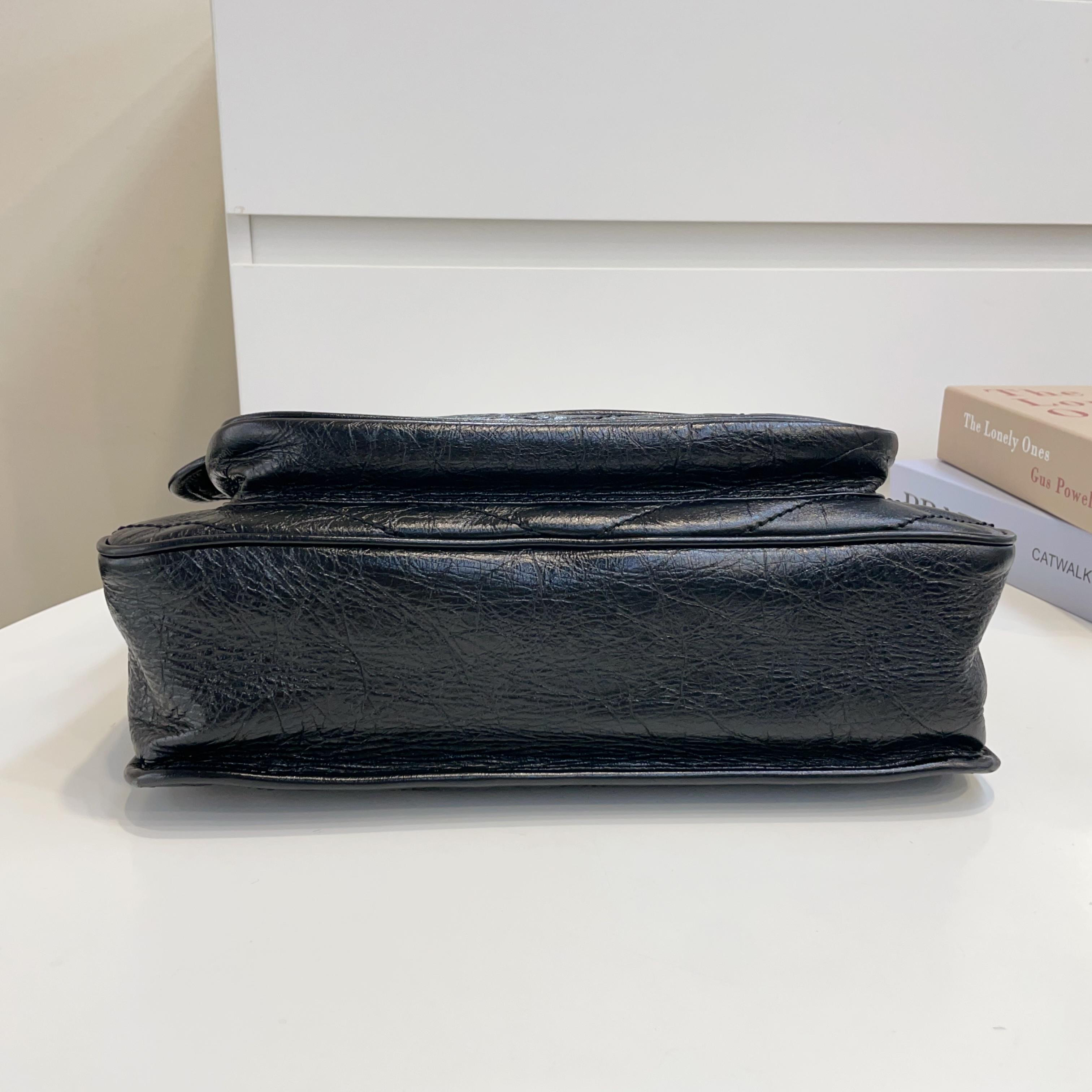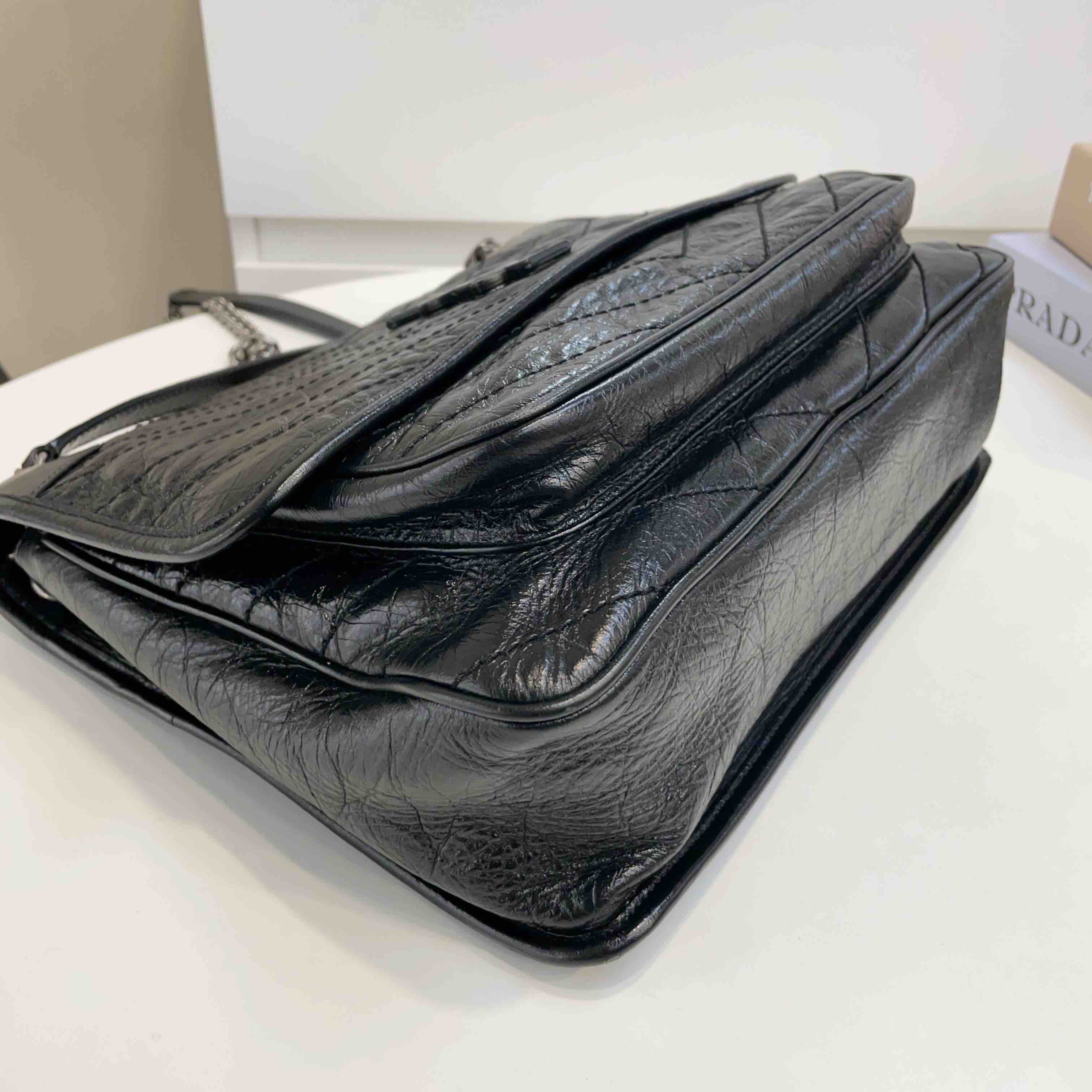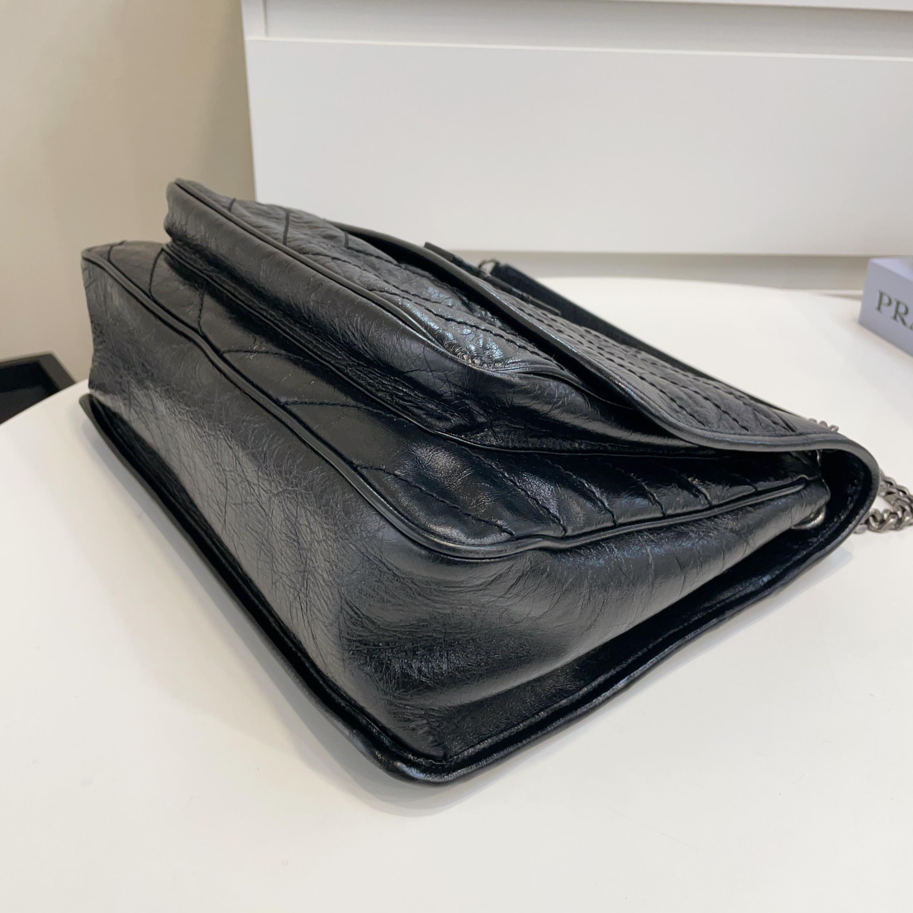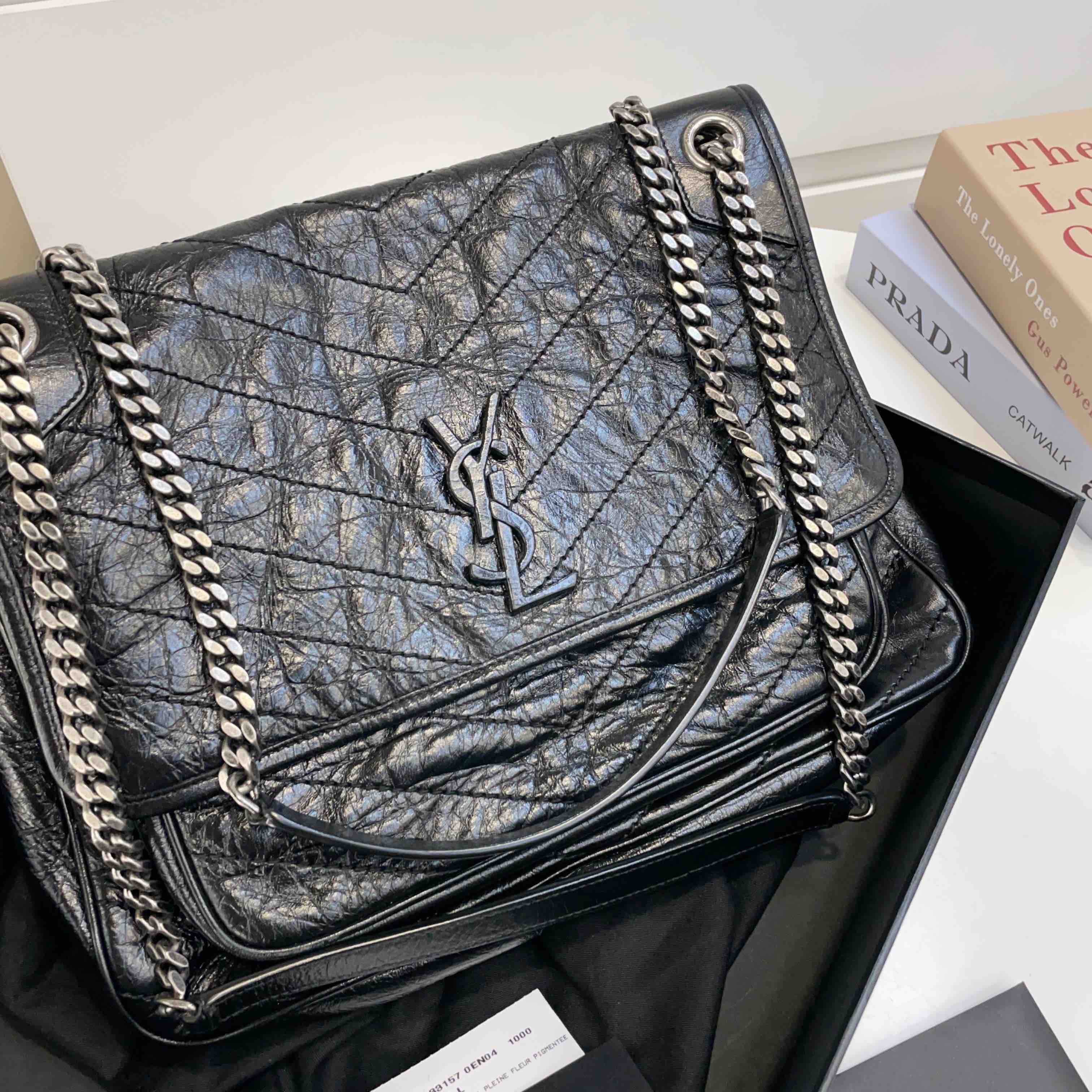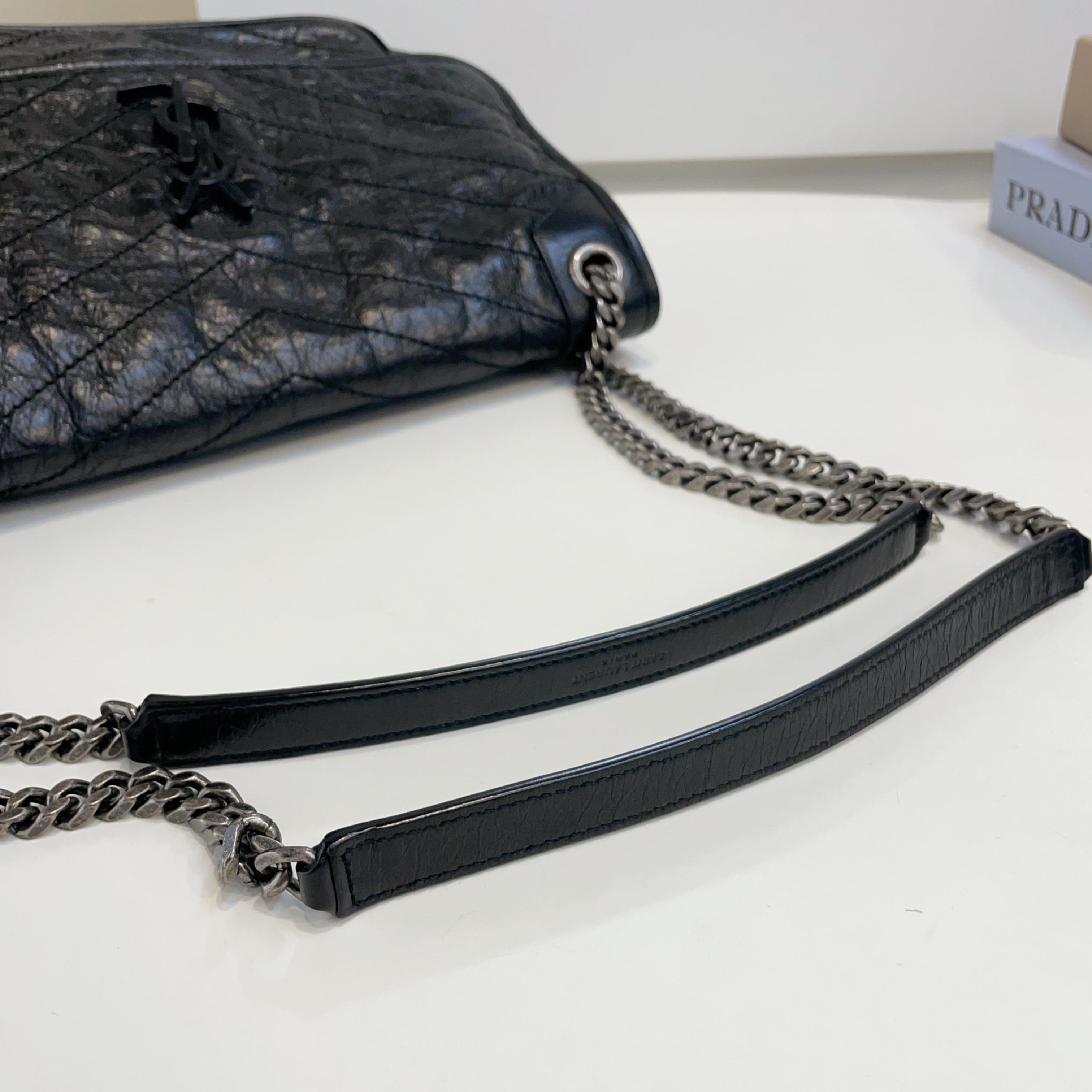 【商品描述】正品二手 YSL 黑色 油蜡牛皮 大号 Niki 斜挎包🍓 97新 32x26 配件:盒、防尘袋、说明书边角和logo扣轻微磨损