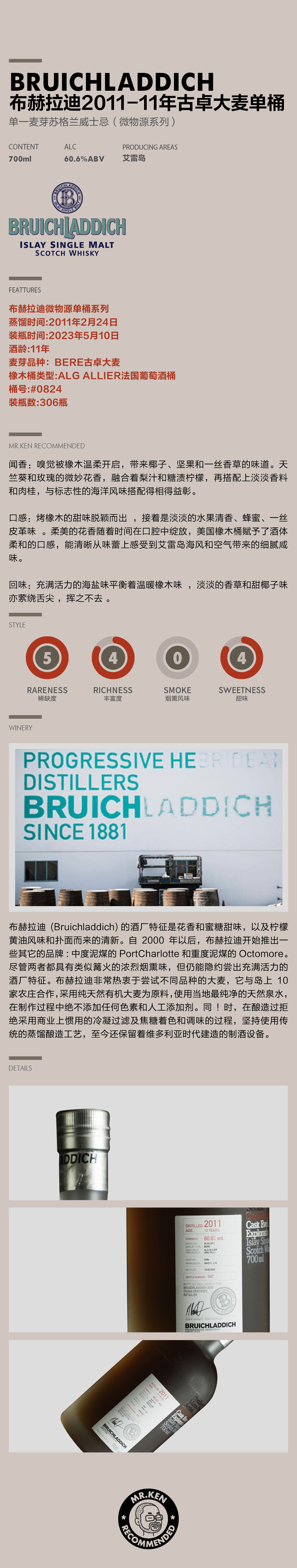 【169900积分】布赫拉迪(Bruichladdich)2011-12年古卓大麦单桶单一麦芽苏格兰威士忌(微物源系列)