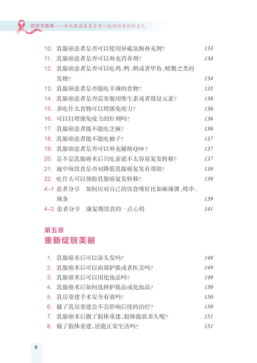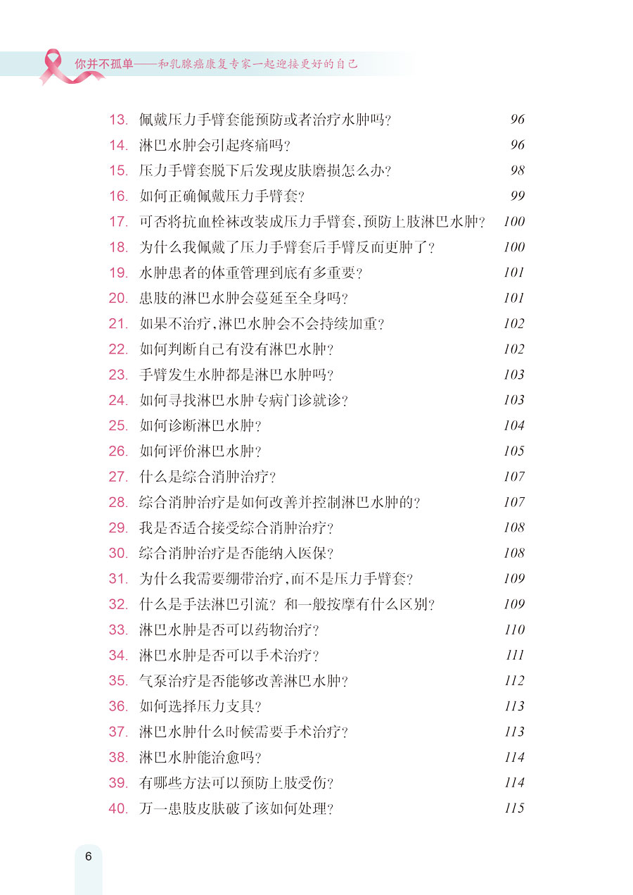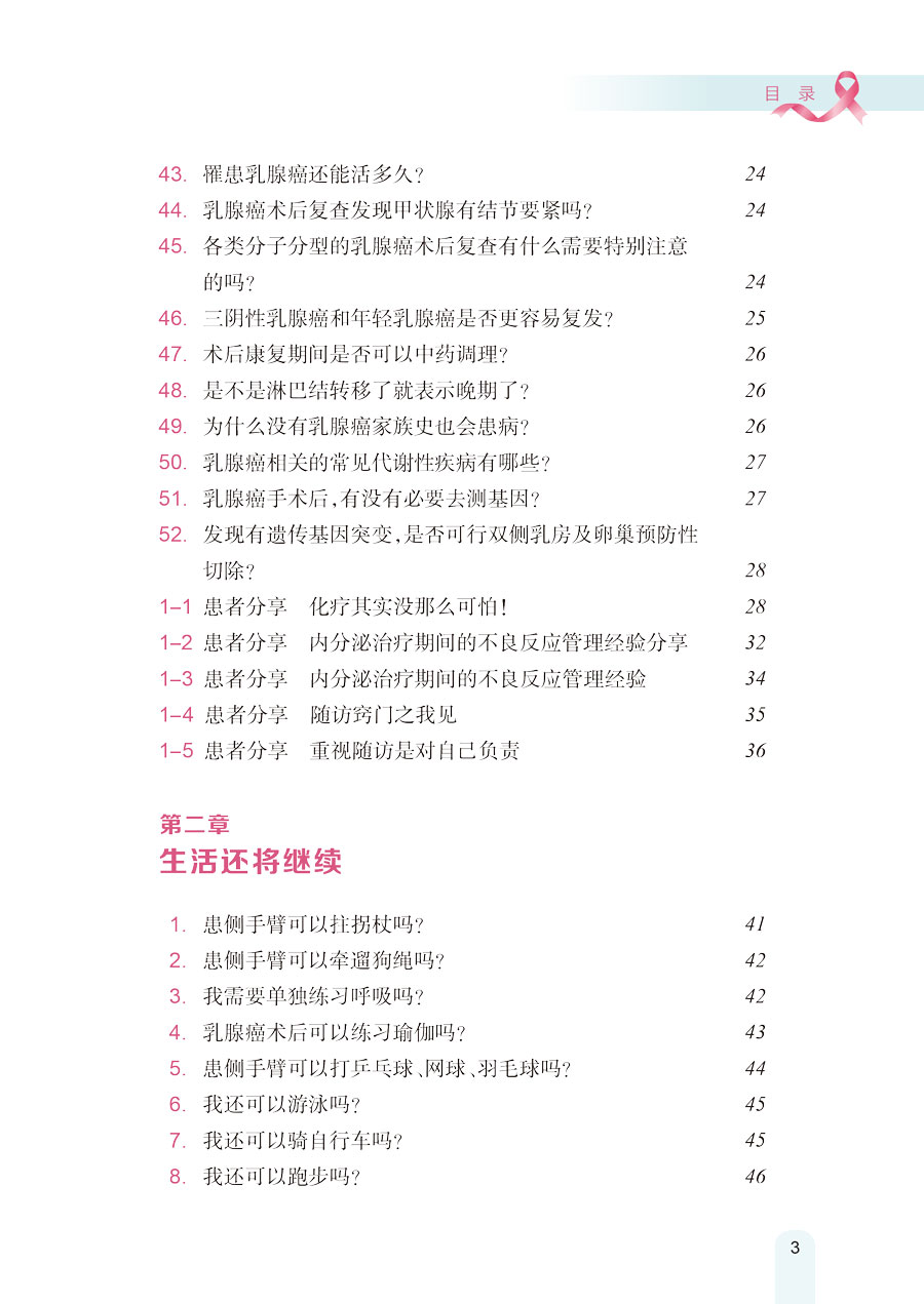 本书集合了众多乳腺癌领域及康复护理领域的资深专家,梳理临床诊治尤其是康复过程中患者提问频率最高的话题,采用一问一答的形式予以解答。本书对术后的治疗随访、功能康复、心理健康、淋巴水肿防治、日常饮食宜忌、外形维护等领域的问题进行细致入微的解答,让乳腺癌患者生存期延长的同时,所伴随的疾病也获得及时有效的诊断与治疗,患者的生存质量亦能得到显著提高。本书同时也收集了众多康复之路上稳健前行的患者分享的经验与感悟,这些经验与感悟充满了对生命的热爱和对病友的关怀,为正在康复之路上彷徨的患者提供了有力的支持。